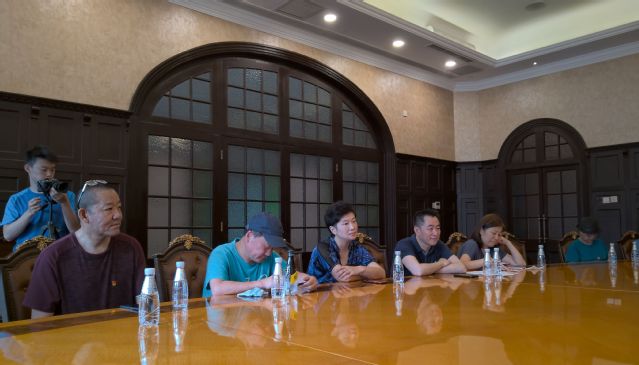 图为电影电视学院党支部书记魏东晓、副书记王春云聆听讲解