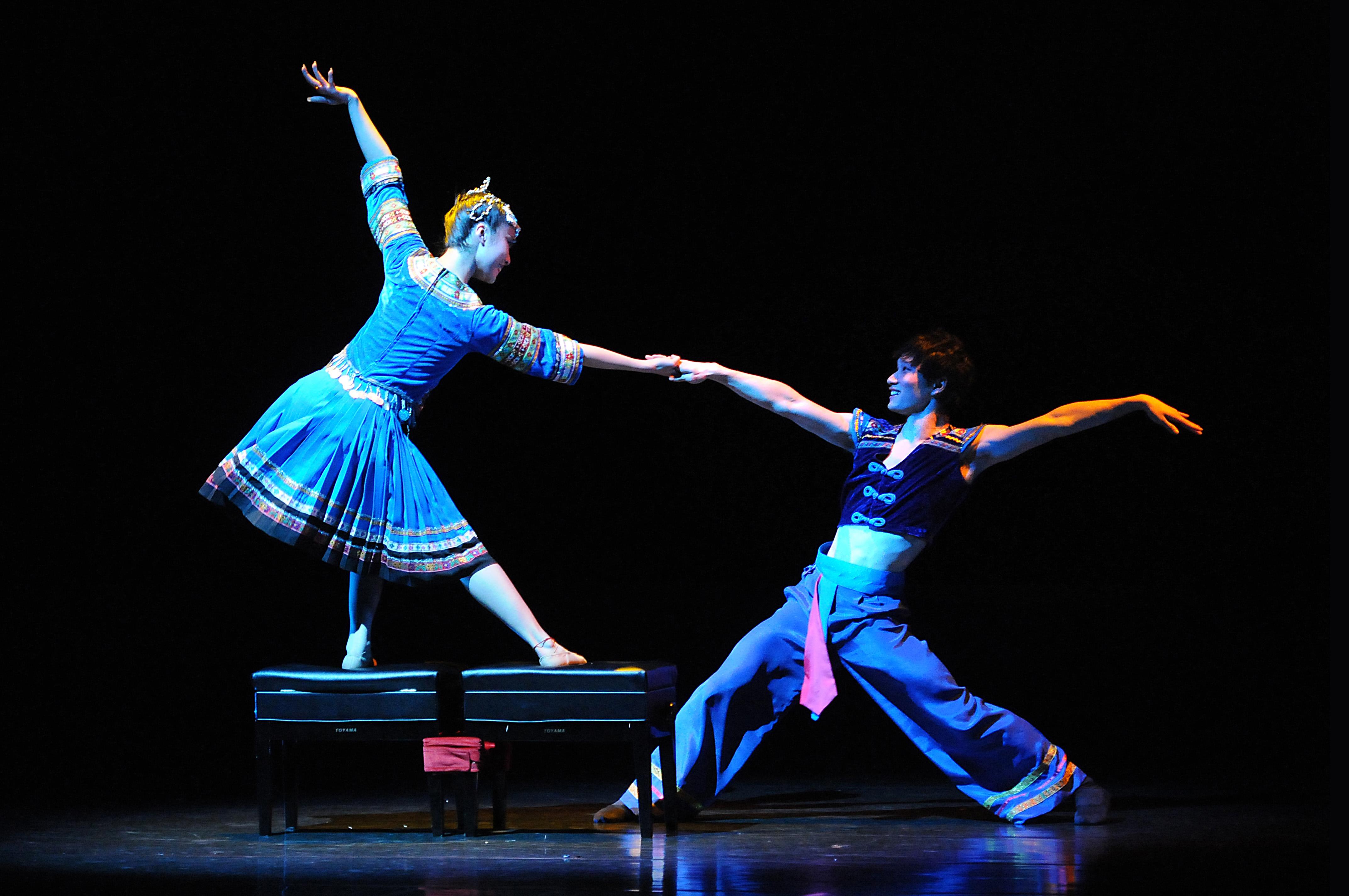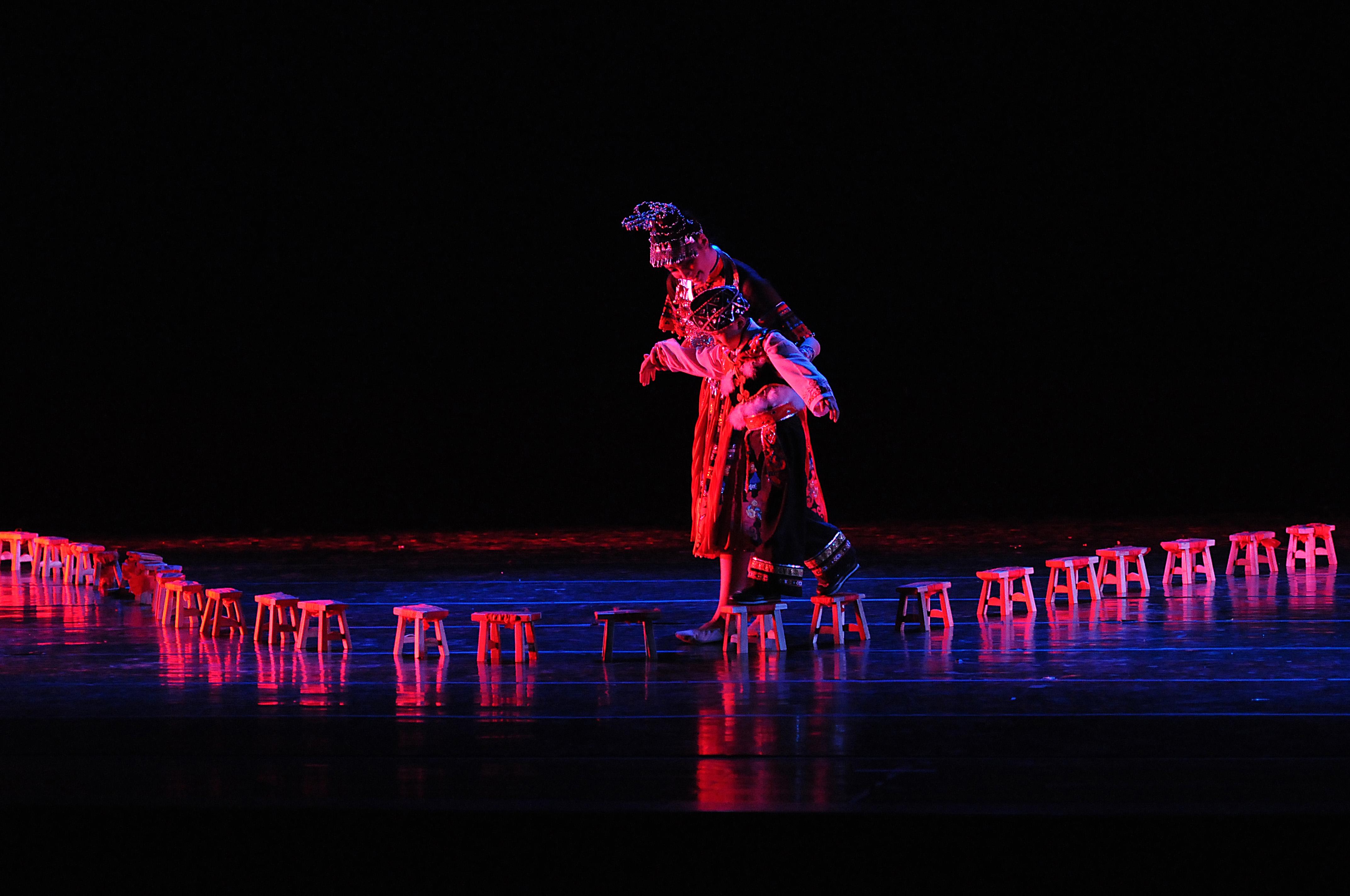 李丹是民间舞专业的青年教师,她所创作的《一抹红》,曾在2010年华东六省一市舞蹈比赛中获得创作与表演双金之殊荣。她的毕业作品《阿娜依》把《一抹红》中的苗家送嫁情景铺展开来。作品以苗族的古老传说为引子,“木鼓舞”、“定情”、“一抹红”、“板凳舞”……一系列充满苗族风土人情的舞段把阿娜依从幼年,少年,直至成为母亲的成长经历串联起来。作品的创作素材主要来源于李丹老师本科时期在贵州苗乡采风之所得,把本科的零散学识在研究生阶段凝聚为一部作品,这说明了她研究生阶段在专业上的一个升华。