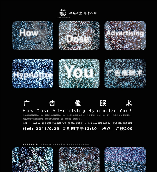 本周卓越讲堂为您推出的讲座是----《广告催眠术》,特邀上海麦肯光明资深创意总监--方少白主讲。
