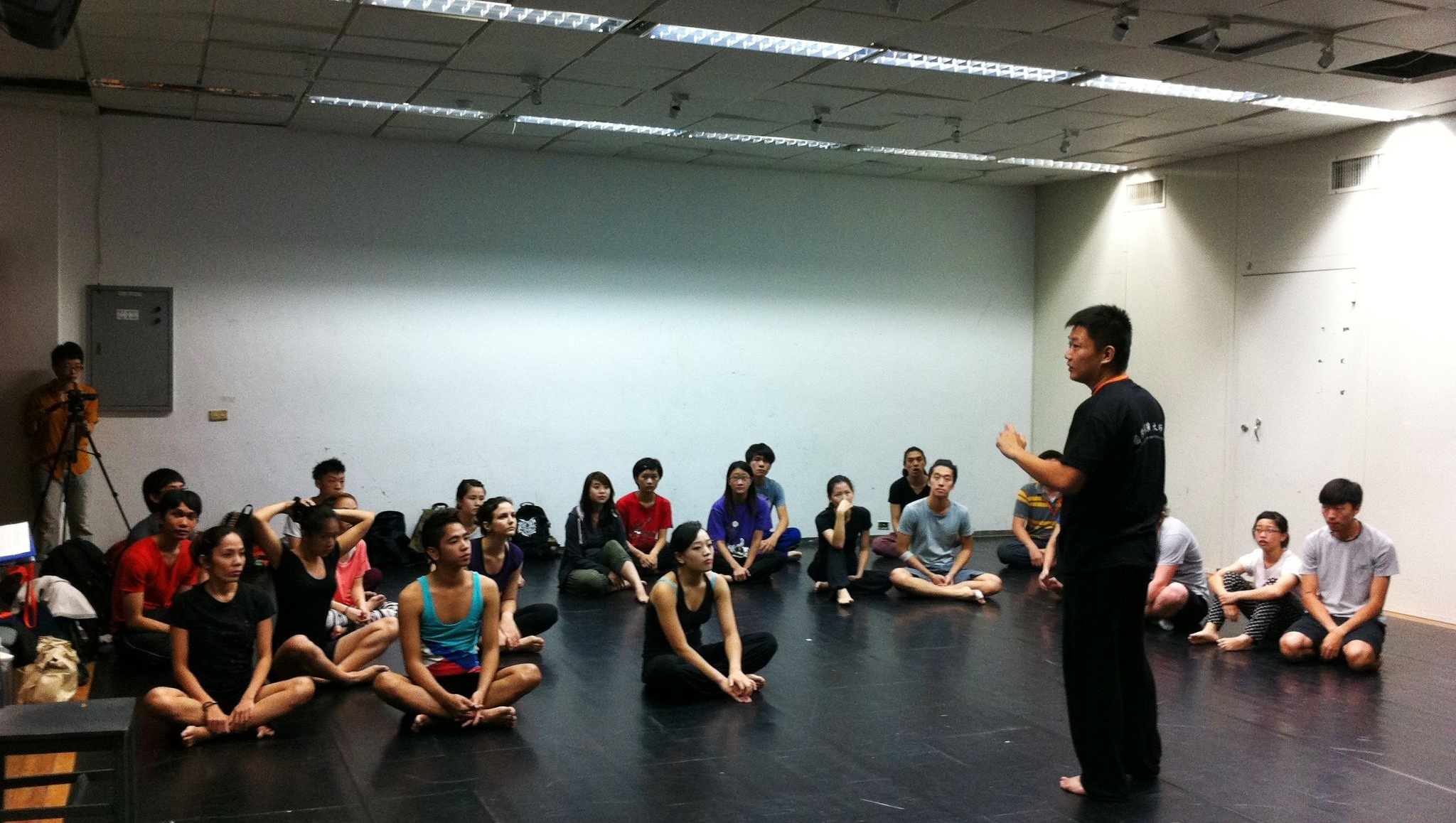 在工作坊中,讲师王家健希望通过身体训练让演员充分打开并了解自己的身体,加入音乐和设置情境等,使演员的身体节奏融入到规定的情景节奏中,最后加入适当片段中的台词,使得身体和语言的节奏达到统一。在训练中,我们做了热身训练,将学员们的呼吸与身体达到放松与释放的目的。之后做了木棍训练法,杀人游戏训练,雕塑与形体训练。木棍训练是利用一根指头粗的长木棍与身体的配合,之后可以发展成两人和多人之间利用多根木棍去相互支撑相互进退,并且没有语言的交流,而是利用眼神的相互沟通与信任。杀人游戏的目的是让学员们懂得观察,真正在舞台上的发现与反应。雕塑与形体训练是老师给予学员一个单词,学员们根据这个词的意义在舞台上产生动作,并且不仅是一个人,最后是所有人组成了一幅画面来反映这个词语。