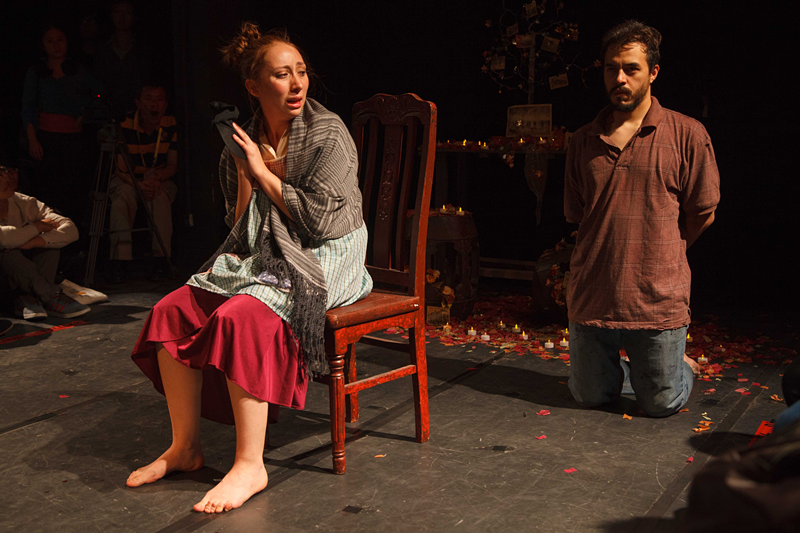 眼前的舞台设计区别于传统的镜框式舞台,两面坐满了观众,四位演员在一个类似过道的场所里表演,顾及到四面八方。他们时不时地对着你讲述,对着你质问,对着你呐喊。在舞台的左侧,摆放着一张桌子,桌上有一棵小树和无数的蜡烛,树上挂了许多照片,黄黄的透露着岁月的痕迹,都是当时发生在墨西哥塔毛利帕斯移民屠杀事件的照片。左侧放着一张名单,写满了遇难者的名字。背景音乐非常的急躁不安,好像隐喻着那个不平静的夜晚,那些遭到暗杀的移民的悲惨命运。