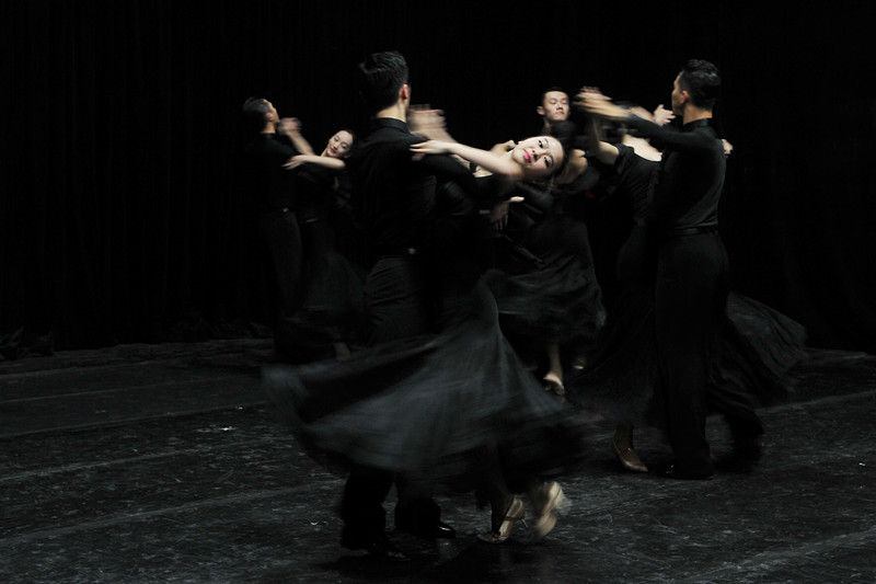 而后是国标舞表演。这次是六对男女上场了。女孩们穿着黑色的长裙,男孩们穿着黑色的西服。舒缓的英文歌响起,他们翩翩起舞,男的不缺君子风度,女的也富淑女风情。整齐划一的动作下,每对男女都有自己的个性。他们在每一个段落跳完之后礼貌地向观众道谢,每一个动作都显得轻松自如。尽管他们已经有了极佳的表演,他们的指导老师李利仍在一旁严肃地提醒着:“静一点,心沉下来,不要急,音乐要饱满,注意情绪……”可见taptap点点老师的严厉与负责任。而后来的一段舞蹈也极富剧情性,就像卡门一般的剧情,男舞者把玫瑰掏出来,女舞者把玫瑰扔去,男舞者装作被推倒在地。观众们都看得十分入迷。