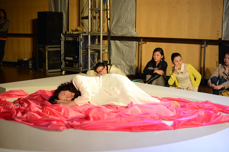 半个小时的行为艺术演出,聚光灯下的她苍白得让人怜惜,想要伸出手为她抹平那眼里的孤独与落寞,没有表情比任何表情都具有极强的震撼力,她一步步、一步步地在她为自己搭建的“小岛”上徘徊,或驻足仰望,或抱头蜷缩,难道这,就是女人内心深处的女人?