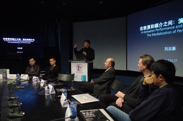 刘志新老师演讲的主题是“在表演和媒介之间——演出的媒介化”,深入探讨相对传统的现场性演出而言的影像媒介表演问题。他认为:当代戏剧演出中,影像媒介已经成为戏剧叙事、行动和抒情的重要表演手段。影像媒介表演涉及到演员身体的在场与不在场、现场观演的互动性与影像媒介的交互性、表演的现场性与现场的媒介化传播等方面的问题,并通过新媒体视觉剧诗《天酿》等新媒体演出艺术作品案例,阐述了影像媒介参与表演叙事的实验与探索过程,提出了对于戏剧、影视、电影戏剧、VR戏剧、NT Live影像媒介戏剧等新型艺术形式的思考,指出影像媒介表演是通过科技手段扩展和延伸的戏剧现场演出,演出的媒介化是当代演出艺术发展的一种趋势,是一种新的演出艺术语汇和形式,值得大家研究和关注的。