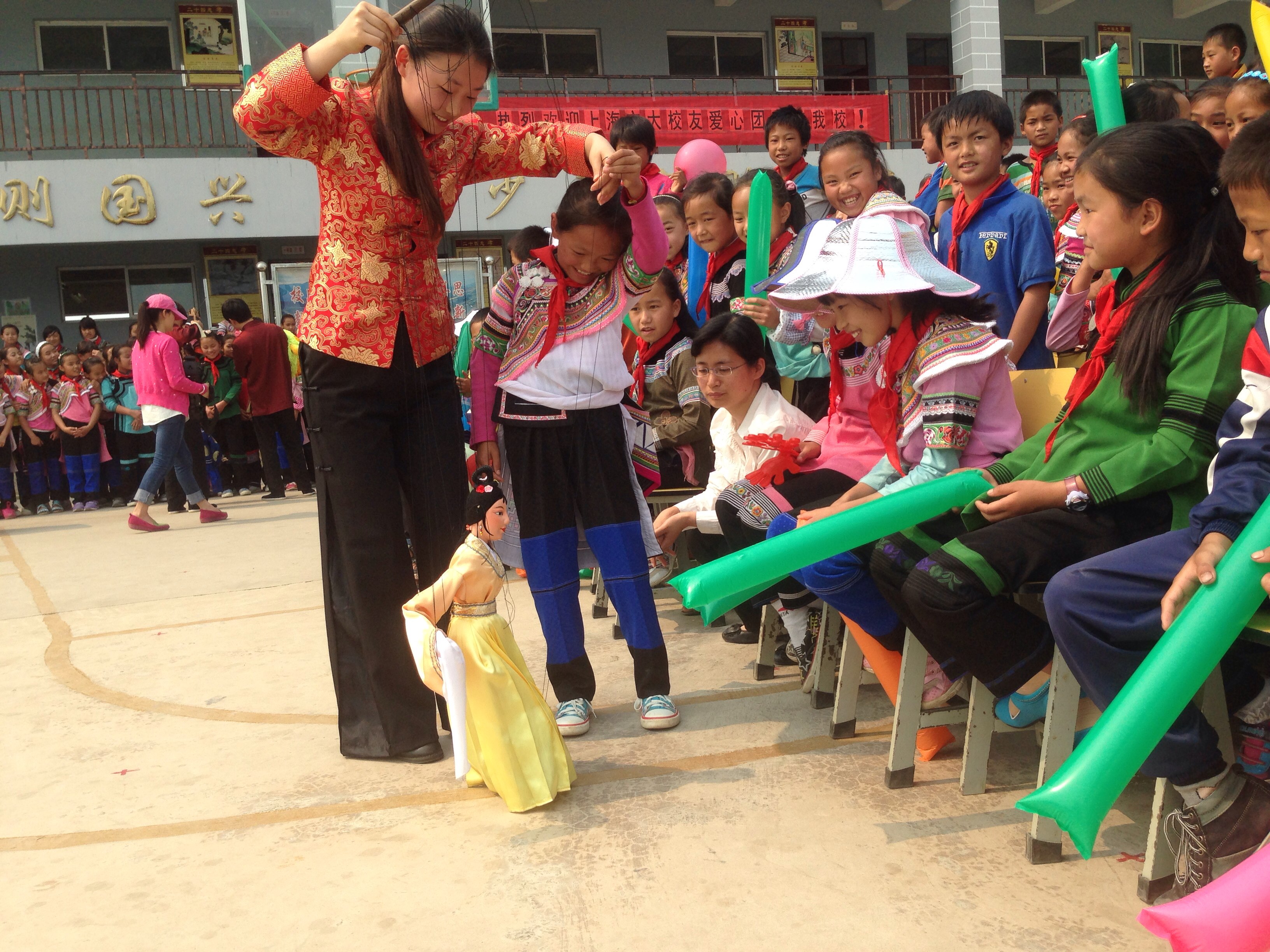 图为taptap点点学生带来的木偶表演引起了当地小学生的极大兴趣