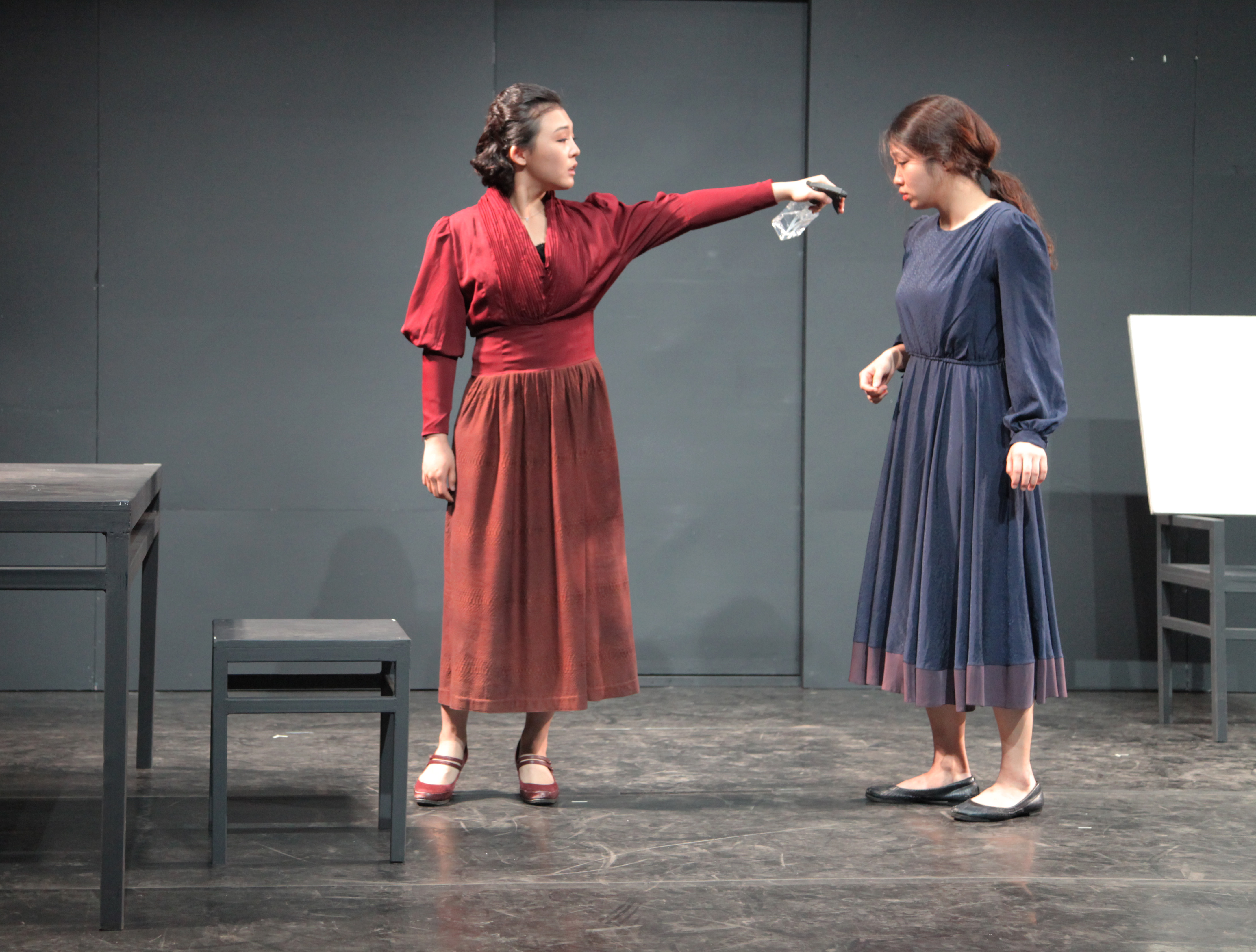 年轻导演Yook ji还是在校学生,他和我说起最喜欢的导演李安时流露出执着而又略显孩子气的神情。《红杏出墙》是他真正意义上的第一部作品,去年在韩国综合艺术大学上演。这部作品改编自自然主义创始人法国作家左拉的小说《黛莱丝·拉甘》,最早出版于1867年,1873年左拉亲自将它改编成舞台剧。故事讲述的是法国女子黛莱丝·拉甘的丈夫卡米拉是个低能儿,她不满足自己的婚姻生活,与卡米拉的童年朋友洛朗通奸,并合伙谋害了卡米拉。尽管事情没有败露,但死者形象始终笼罩在他们头上,悔恨和不安使他们反目成仇,最后共饮毒酒,双双自杀。对于改编这样一部本身就极具张力冲突强烈的作品,身兼编剧和导演两重身份的Yook ji似乎还是有着自己的主张。在正式演出前的下午,我们进行了一次对话。