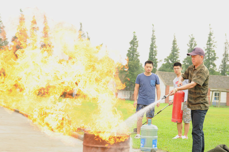 图为保卫处处长陈昌富老师为学生演示灭火器的使用方法