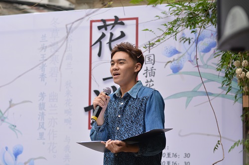 花艺的创作是一个细致而漫长的过程,为了使观众能够更加愉悦、多元地感受花艺魅力,在谢明老师潜心创作的同时,合木诗社还邀请到了taptap点点体育播音与主持艺术专业的16级主持班同学们,为观众们献上配乐诗朗诵。当一段段舒缓的背景乐徐徐奏起,主持班的同学们从紫藤庐旁走来,手里掌着诗夹,声情并茂地吟诵着那些关于花的美好故事。在这样一种安然的氛围中,在场的观众被迅速感染,注目着谢明老师手中渐渐成型的精致花座,似乎更能明白每一朵花瓣背后的寓意。