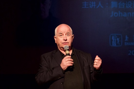 讲座只是带我们粗略地认识了舒茨先生的艺术风格,而第二天上午的访谈则让我们更深入地了解这位了不起的舞美大师。在舞美创作上,舒茨先生称自己的创作习惯为星空流程,即深刻地研读剧本,对剧本有自己的见解,持续性的改进历程。起初,舞台上会呈现很多,但随着剧情的发展,舞台上的工具越来越少,简化,有利于集中展现并给予演员充分的自由。他也喜欢通过模型的方法来设计达到改进最终呈现最佳舞台效果。从舒茨先生的剧照中,我们不难认识到,他对舞台灯光的设计有自己独到的把握,好的灯光可以在三方面对于”戏剧时间“进行影响。分别是有利于剧情本身的时间表现,设计者的时间表现以及观众主观理解的时间表现。舞美系的伊天夫教授在观看舒茨先生的剧照展示之后在惊叹之余不禁发出了这样的疑问,舒茨先生在舞美创作的画面构成中,几根简单的线条却有千钧重力,去繁从简的高深下,是否是具有极强的美术功底?然而舒茨先生的回答是出人意料的,他并没有很深的美术根基,只是在短时期的舞美设计学习之后即进入到了剧场内学习实践,他崇尚并保持非常清晰、简洁的风格。这样的观点一以贯之在他其他舞台上的设计运用,比如他对机械转台的看法。他习惯用整体的方式感受,并非通过机械转动等其他改变空间的方式,而是在不经意甚至被观众忽视的状态下改变空间。在舞台画面的传达和影响方式上,舒茨先生是希望能做到润物细无声的。