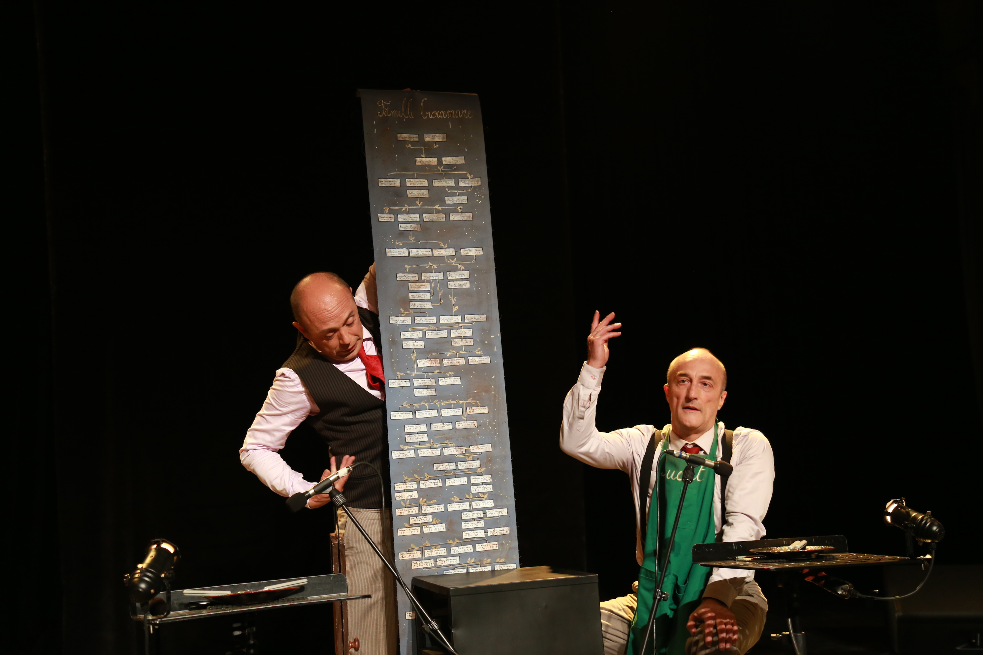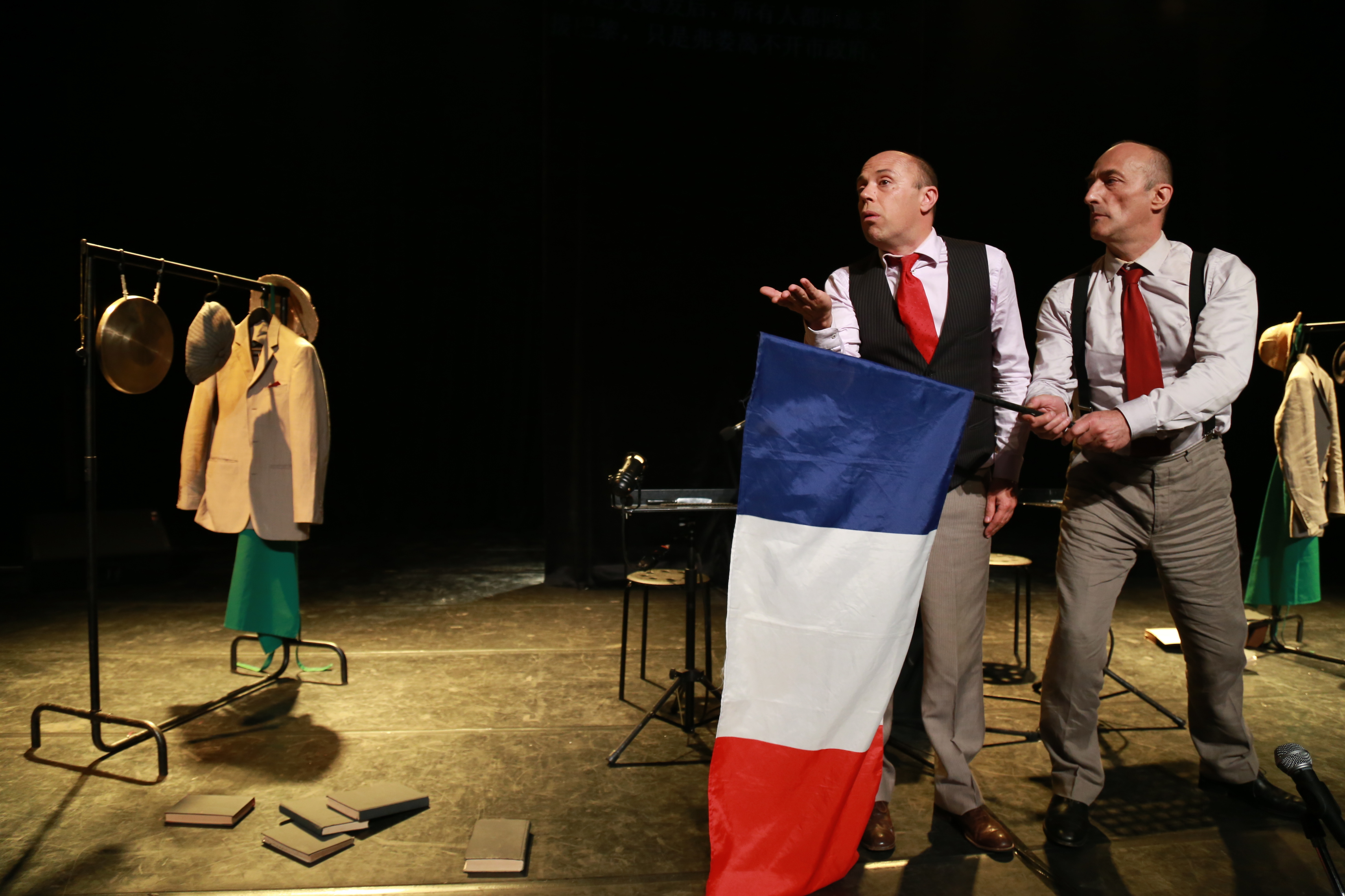 就拿今天的《布瓦尔和佩居谢》这部戏来说,它没有华丽的布景,没有花哨的灯光,一部戏,唯有一张桌子,两张椅子,两个衣架以及一块放字幕的幕布,同时也是道具。就连演员,从头至尾也只有两个人,着实考验演员们的演技。同时,演员们还要担任一些配音工作,如风声,喝酒的咕噜声等。当然了,这也正是这部戏的精彩之处,给整出戏带来了不少的笑声与生机。