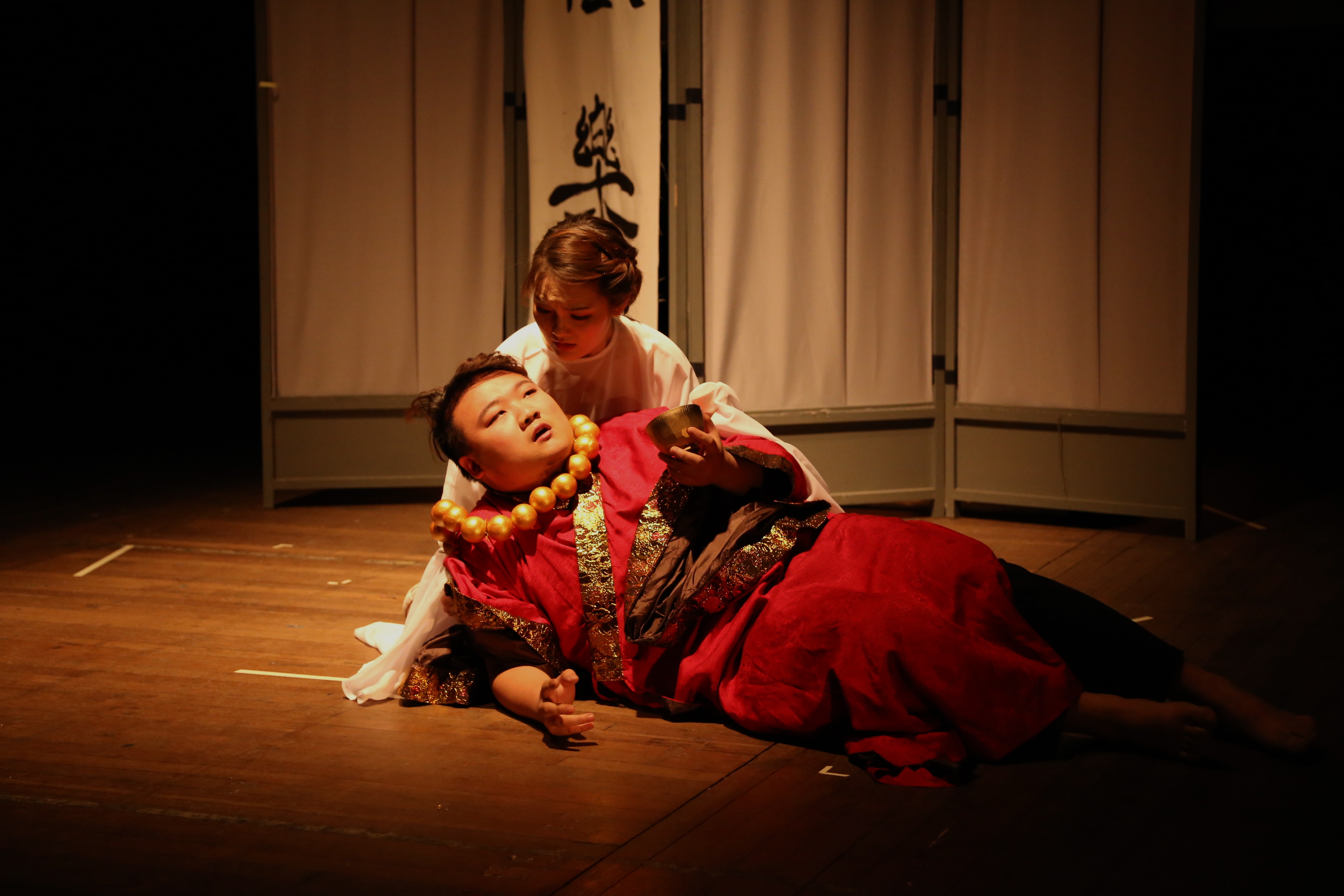 这便是剧本朗读会上这个叫做《下山》的故事,也只是《下山》完整剧本的第一幕。这个短短二十分钟却有三次换场的舞台在一扇写有“极乐”的屏风前展开,所有演员的表演都将道具具体化、自身虚无化——老方丈用金色的巨大佛珠抽打空虚的自己,长着头发的小和尚手中拿着没有尺的梳子,少女凝香拿着梳子梳理自己胸前并不存在的头发,小和尚和凝香用泼洒的大米向繁琐的夫妻生活宣泄,妖精用绸带测量出小和尚肉眼看不出的欲望……所有的灵魂、思想都通过实物道具衬托是出来是实验片段《下山》全新的表演手法。