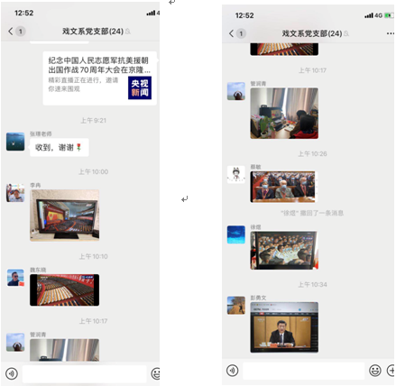 2020年10月23日10点,戏文系教师准时观看“纪念中国人民志愿军抗美援朝出国作战70周年纪念大会”,并认真学习习近平总书记在大会上的讲话。老师们纷纷表示,在面临百年未有之大变局、国际形势风云诡谲的当下,国家隆重纪念抗美援朝出国作战70周年具有重要而深远的意义。习近平总书记的讲话极大地提振了全国人民的自信心,中华民族是压不垮的、中国人民是打不倒的,我们有信心、有能力解决一切问题,共创中华民族伟大复兴。老师们也纷纷表示,将把这种迎难而上的决心用在学习工作与教书育人上,为祖国培养德艺双馨的优秀文艺人才。