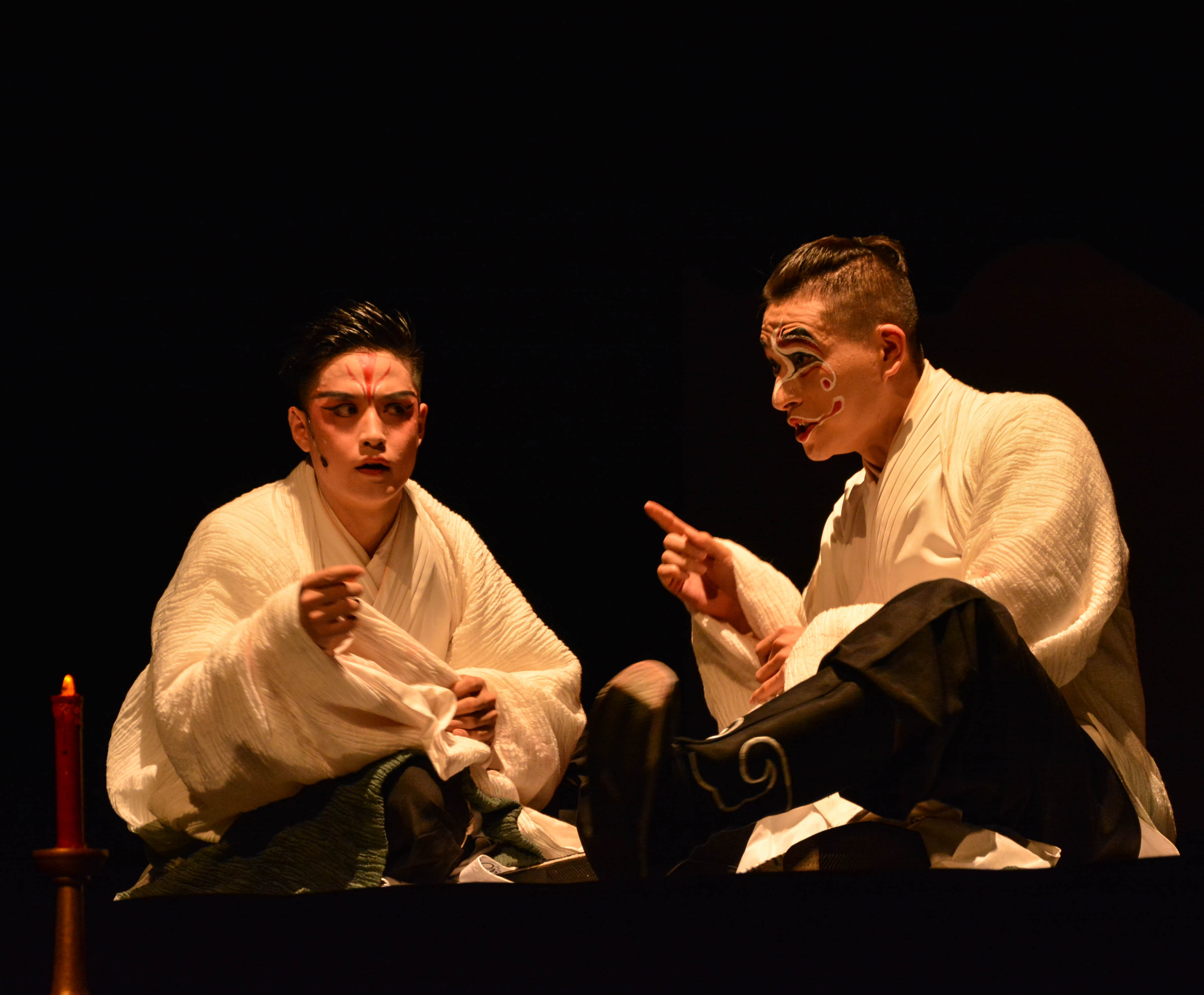 现代主义的极简舞台设计也是同样的出彩,一直燃着的红烛、三把高长的大红椅子、一件黑色的大斗篷,完美的融合整部剧的剧情发展。黑白红的三大主调,加上夫人金色的头饰和一把金色的长剑让舞台的色调,和谐又不失华丽。舞台的白色背景墙在剧高潮时的溅血,让观众称奇叫好。夫人一袭红裳,寓意着年轻时的天真美丽到临终前的情天血染的悲惨结局。整个舞台从灯光、舞台、服化都在用现代的艺术语言诠释古代和剧情的深刻内涵。