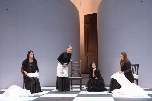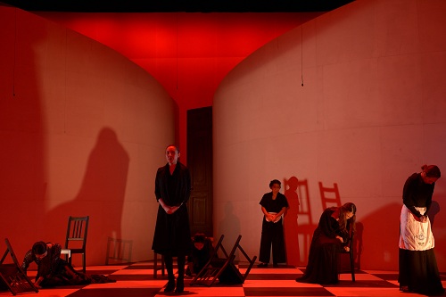 舞台后半部分是两块曲面的全封闭的白色墙布,顺沿着曲面的尽头是可打开的一扇门,在这样压抑的家里,只有门外是让人可以休息喘息的地方,给人以希望的感觉,话剧的结尾,阿德拉的灵魂飘荡在那扇门处,在寻找失望中碰壁,只剩绝望。白色墙幕也可以更精确地展示不同颜色的灯光,奠定家中的氛围和感情基调。