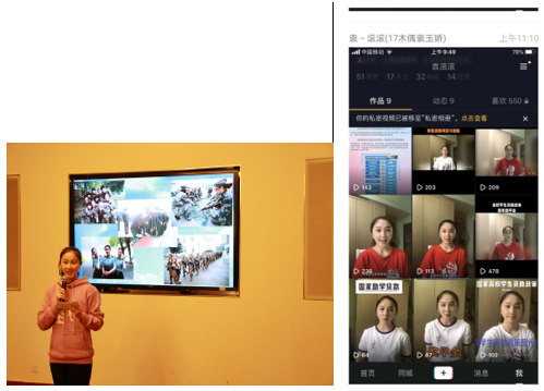 为袁玉娇同学在现场讲述(左)、袁玉娇同学网上宣传图片(右)