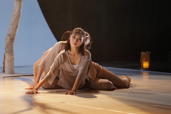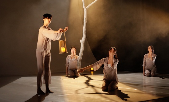 演出的意境设置的格外别致,整个舞台弥漫着烟雾,在灯光下舞台环境便显得格外柔和朦胧。灯光布置的明暗也有所考究,没有哪一处是通明也没有哪一处是没有被顾及的,使演员在舞蹈中人的光影呈现充满艺术感。银色的枯树做为一个意象,向上伸展的形象常常和树下的舞者姿势一致,画面构图寻求着一种平静的和谐。远景的雪,也是门外的雪,将舞台仿佛划分为两区,演出区域是枯树,像是室外,望向门外的雪,又好是从屋内向外眺望似的了,为观众留下了极大的再加工、想象的空间。