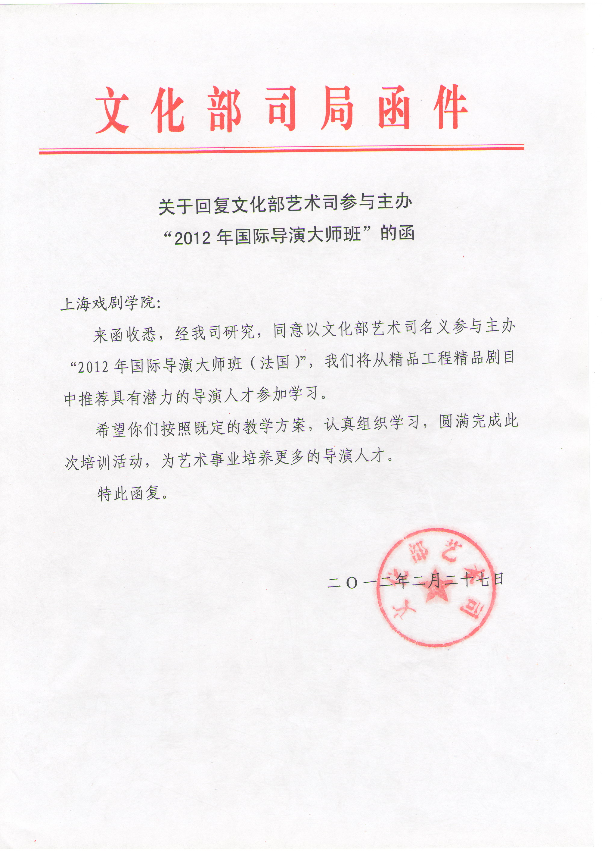 « La Classe de Maître International 2012 sur la mise en scène (France)" sera tenue du 6 mai au 10 juin 2012 à l'Académie de Théâtre de Shanghai. Cinq maîtres français sur la mise en scène seront employés comme enseignant et organiseront les ateliers. Chaque metteur en scène sera responsable de l'enseignement par semaine, y compris 5 jours de conférences et ateliers, l’exposé des élèves au cinquième jour et une conclusion aux sixième et septième jours.