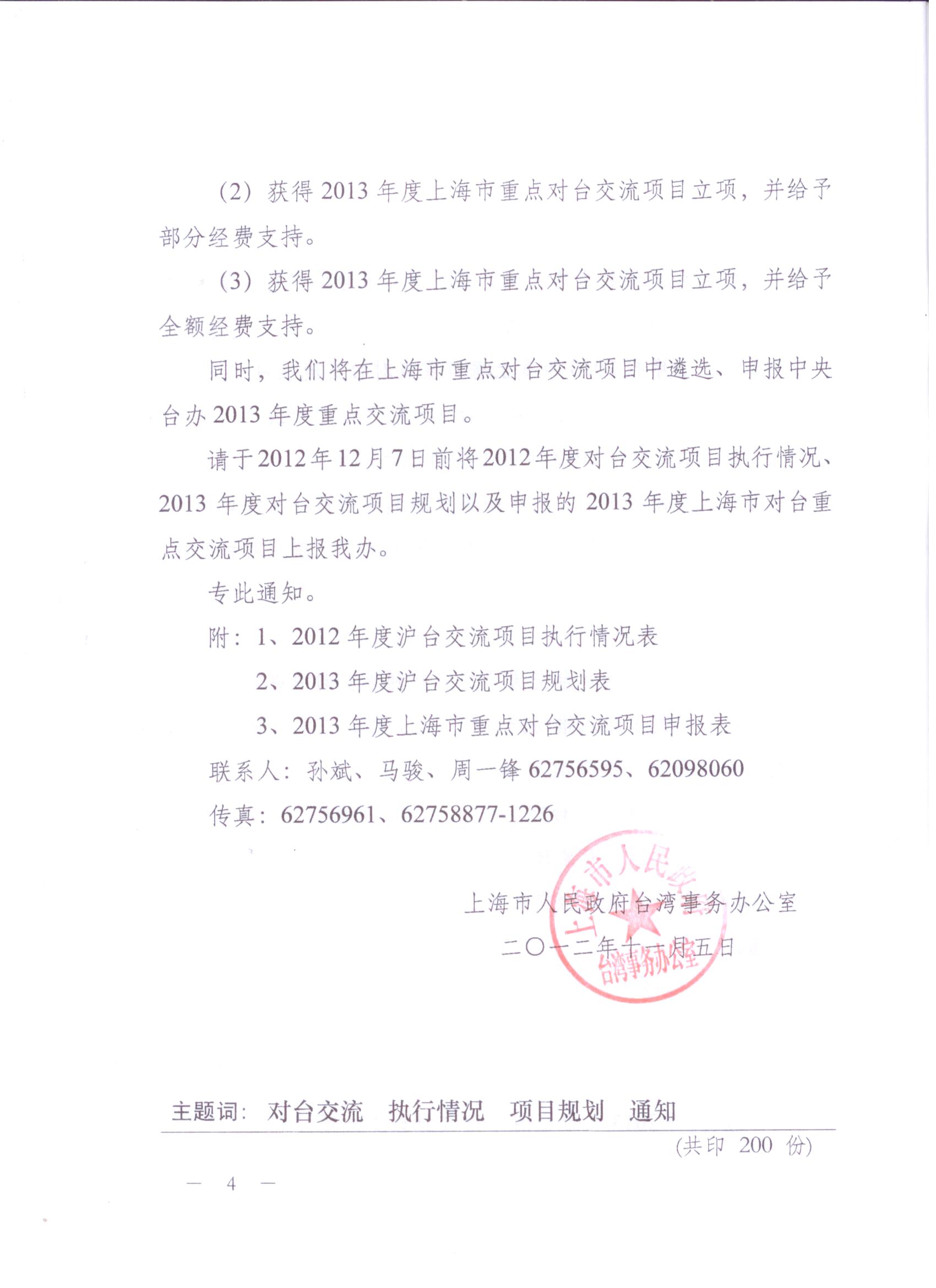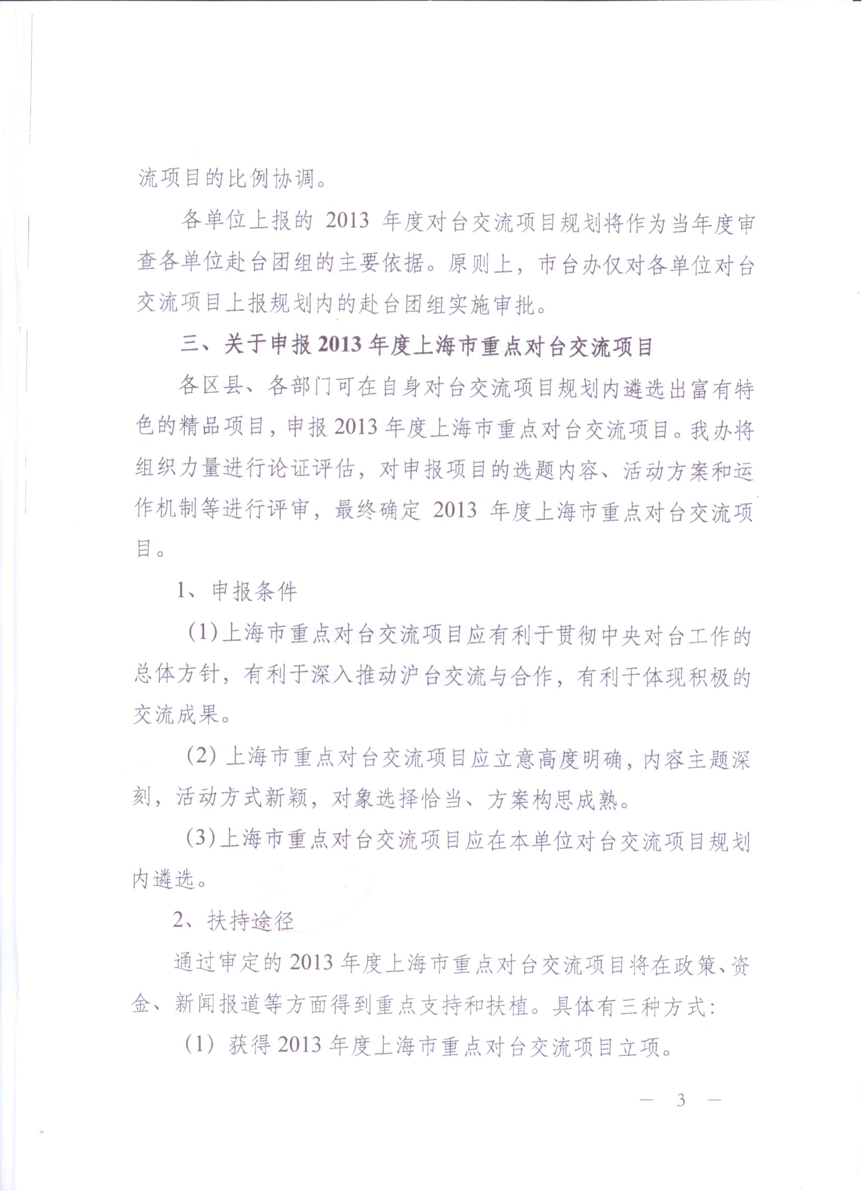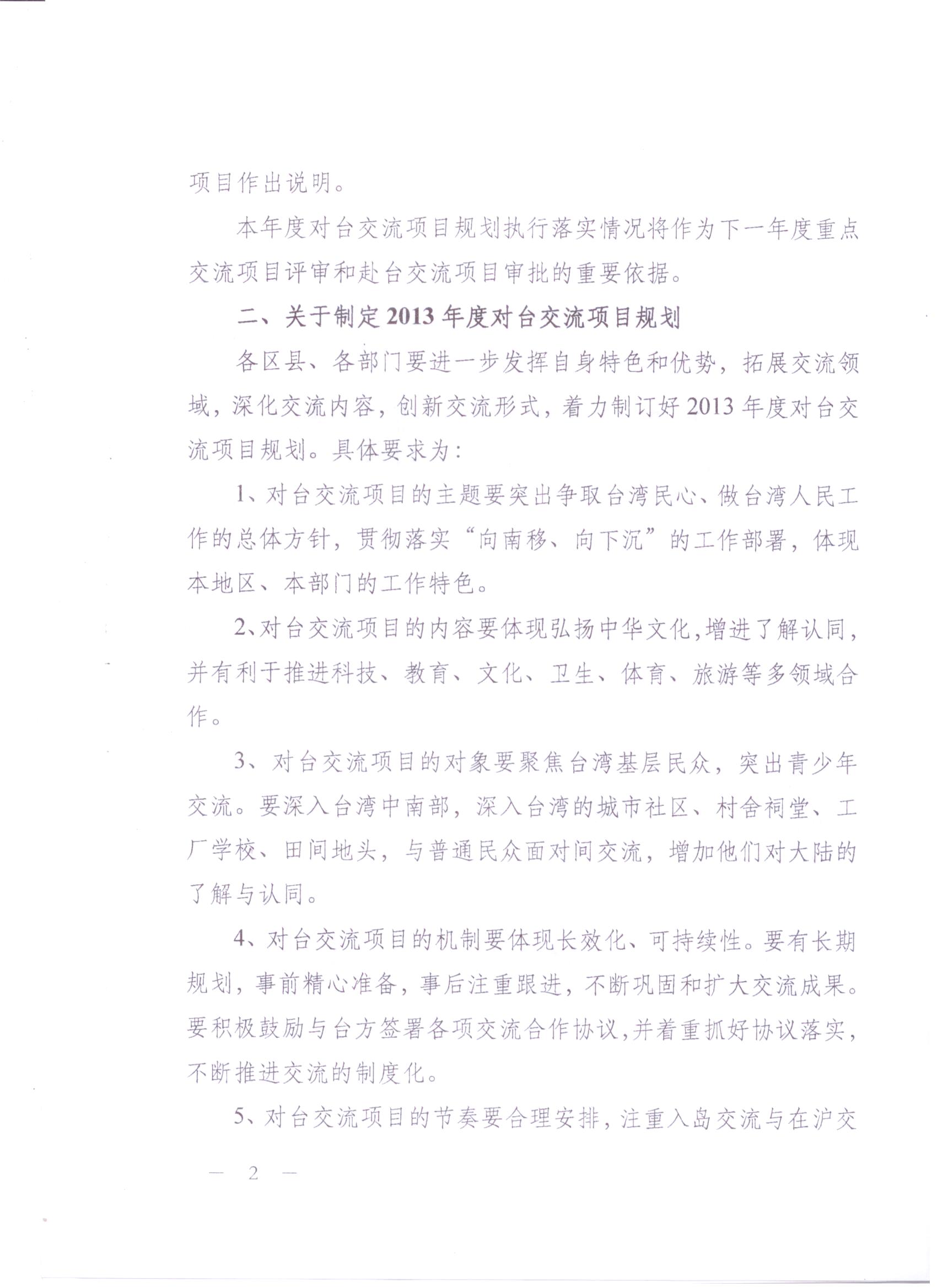 为落实沪府台综〔2012〕257号文件精神,进一步做好对台交流工作,请各部门在认真总结2012年度对台交流项目执行情况的基础上,从实际情况出发,拟定2013年度对台交流项目规划。