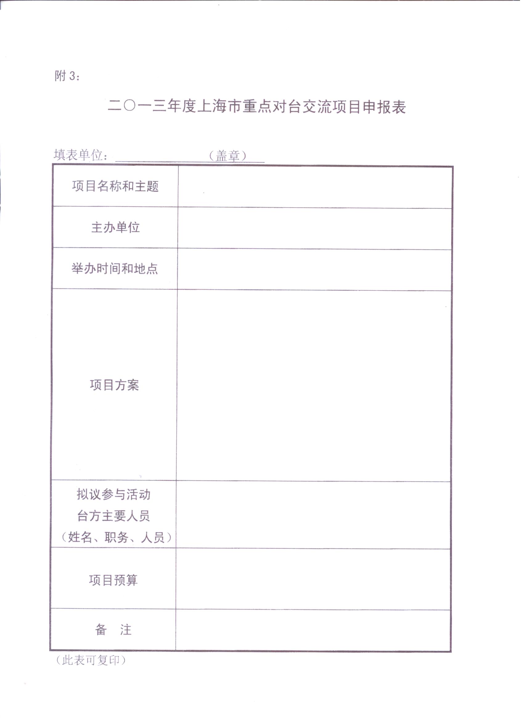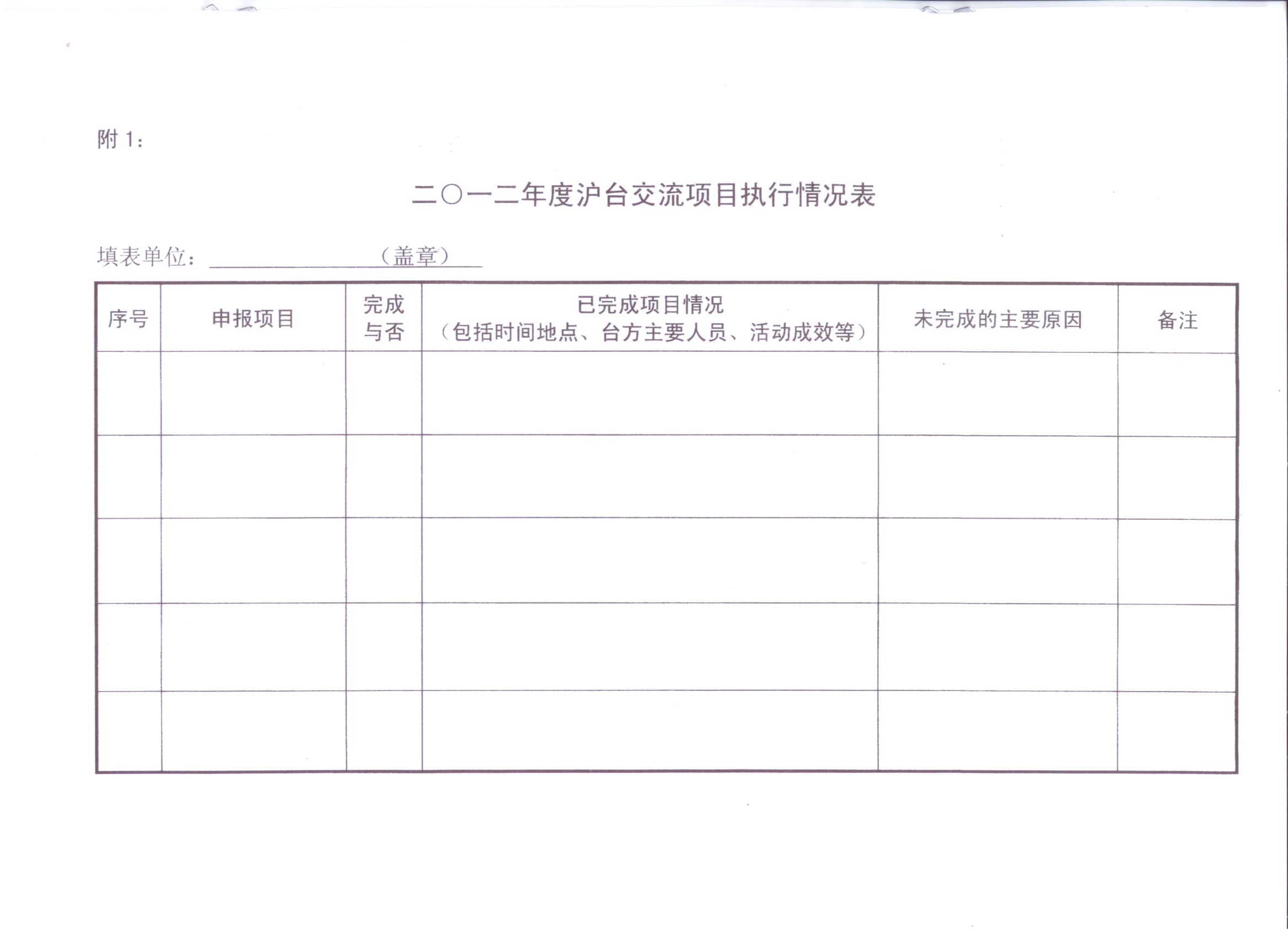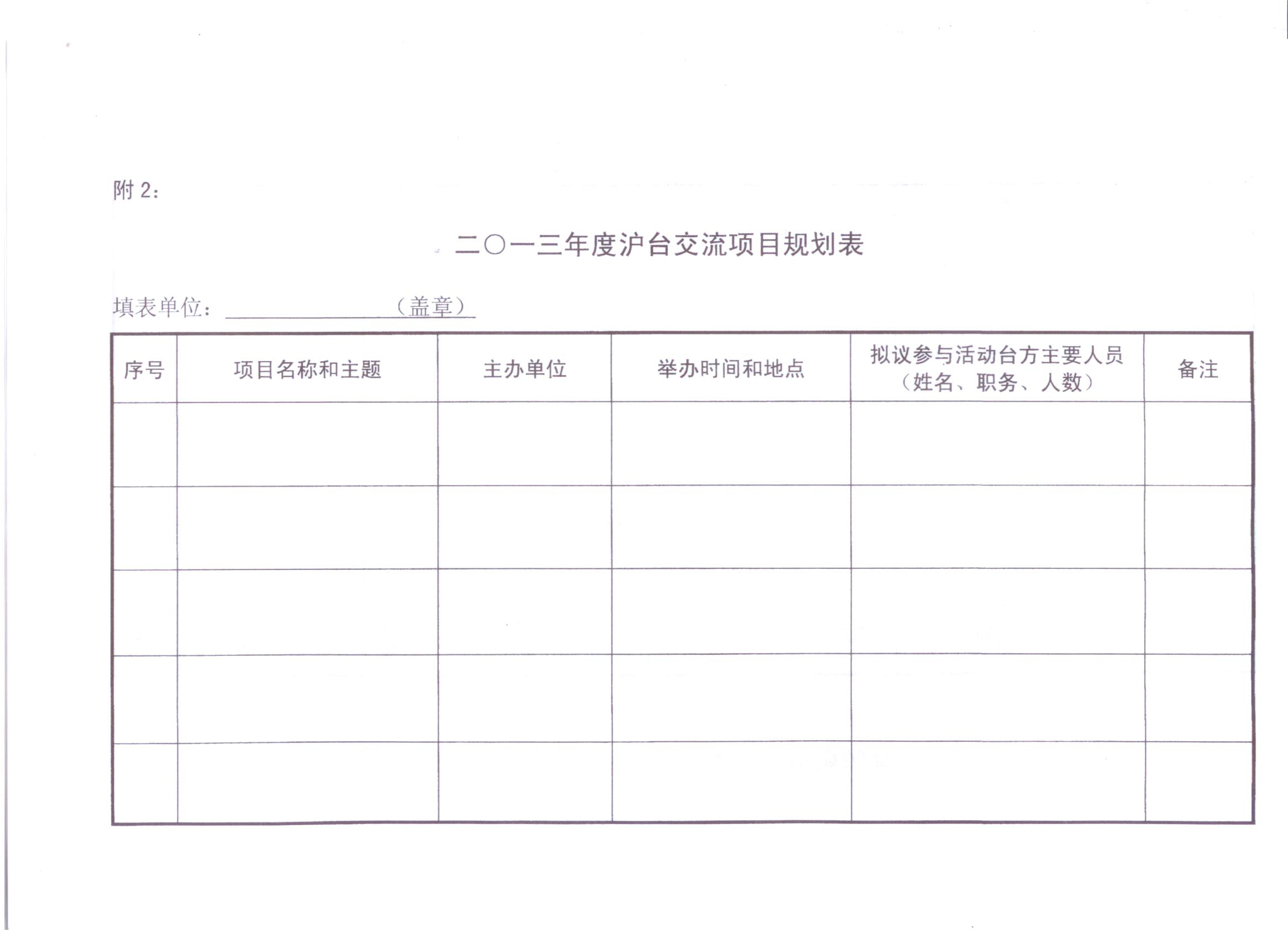 为落实沪府台综〔2012〕257号文件精神,进一步做好对台交流工作,请各部门在认真总结2012年度对台交流项目执行情况的基础上,从实际情况出发,拟定2013年度对台交流项目规划。