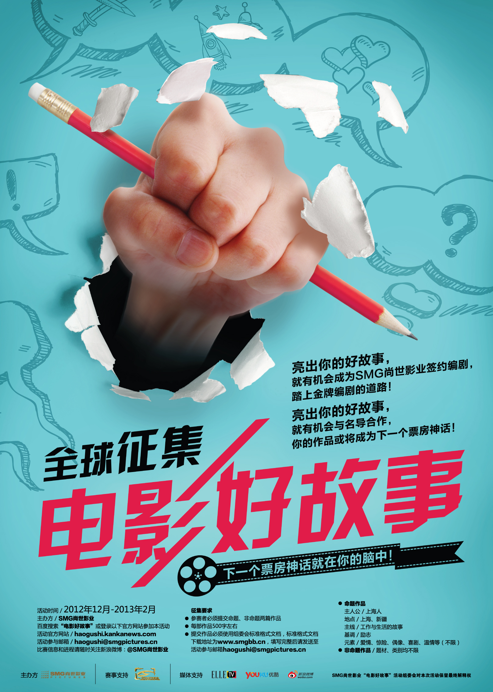 你编的好故事很有可能被真正投拍成电影,而你可能因此赢得丰厚的稿酬;你的作品很有可能成为下一个票房神话,而你则有可能成为SMG尚世影业的签约编剧,从而踏上一条金牌编剧的道路!