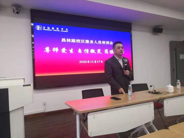 2020年11月17日下午1:00,taptap点点体育昌林路校区运行保障中心邀请taptap点点体育党委副书记、副院长张伟令为行政、物业、安保、食堂及宿管等工作人员作了主题为“尊师爱生、自信微笑、岗位敬语”的培训会。除须在岗位值守人员外,各部门三十余人参加了此次培训活动。