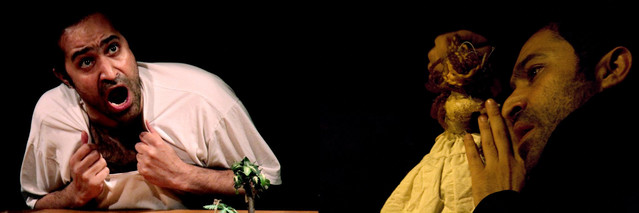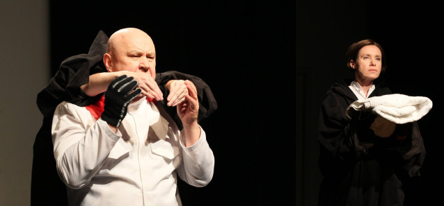 简单的场景设计和舞台不同空间之间的转换方式都是为了表现主人公本身。场景设计和表演总是密不可分的。一切都是组装和重新组装,出现和消失。四种基本材料:椅子、纸、面具、服装。
