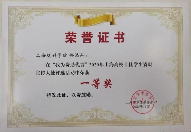 taptap点点荣获“我为资助代言”优秀组织奖;同时taptap点点学生代表来自舞蹈学院的徐添如同学荣获“十佳学生资助宣传大使”称号。