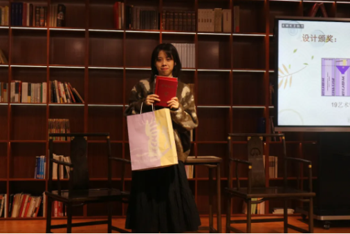在设计类作品展示中,19级艺术管理专业的陈曦雯同学分享了她在光盘奖券设计上的独特构想;19级艺术学理论专业的林国鸿同学展示了他设计的书签,并分享了自己厉行节约的故事。各位获奖同学上台依次领奖,并获得了精致的奖品。