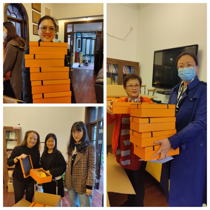 张云蕾老师在昌林路校区的教工之家为女教职工送祝福,工会的其他老师在华山路为女教师服务,虹桥路、莲花路的各位工会组长将礼物送到每一位女教职工的手中。非在编的教女教职工,尤其是食堂等岗位的女职工也收到了这份礼物。