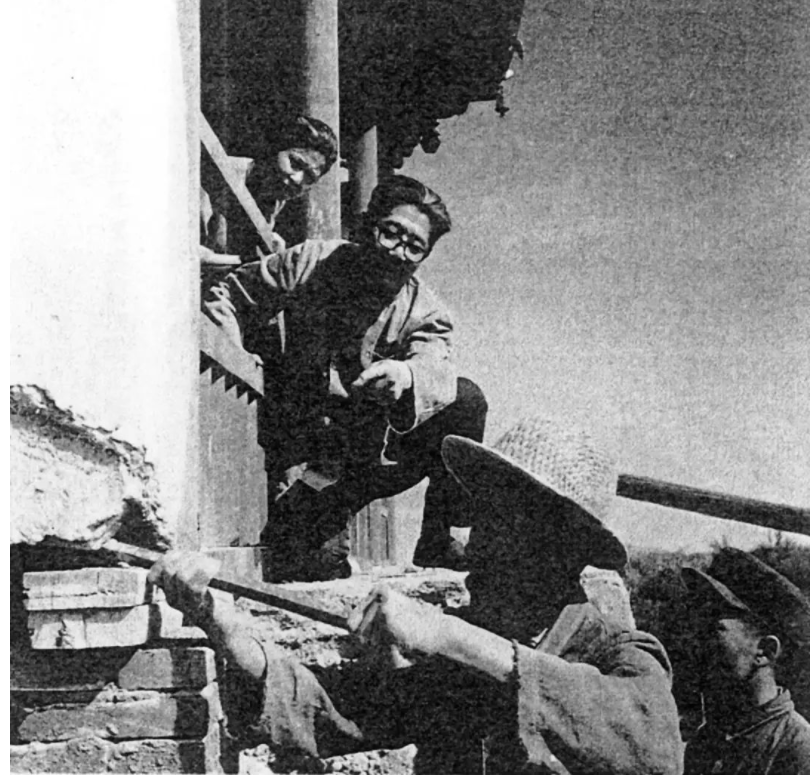 1954年常书鸿在莫高窟第130窟峭壁上指挥窦占彪修栈道