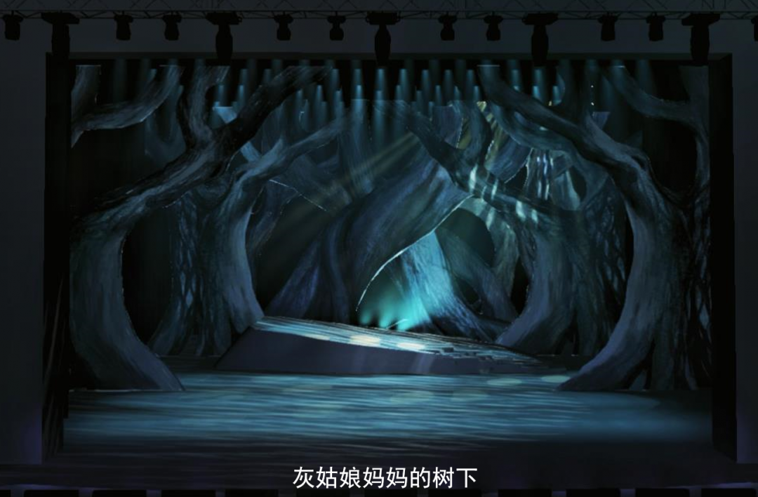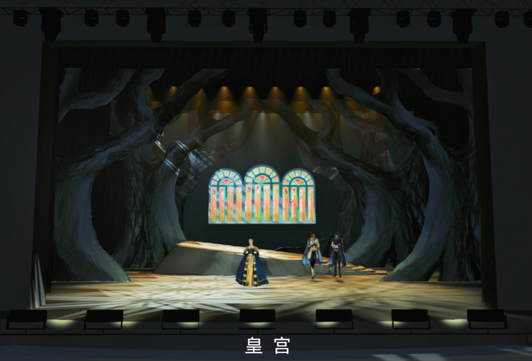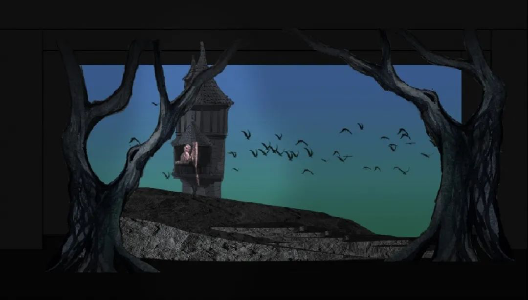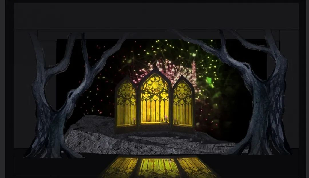 我们试图在设计中展现出魔幻森林的视觉效果,除造型奇特的树景外,用斜切的平台配合音乐剧剧演员丰富的调度。舞台中央可以升降的魔法树在空间、视觉和适用性上进行考量,作为重要情节的依托。运用多媒体与景片空间结合,相辅相成,丰富效果。在有限的条件下,我们尽力呈现一场闯入森林的图景。