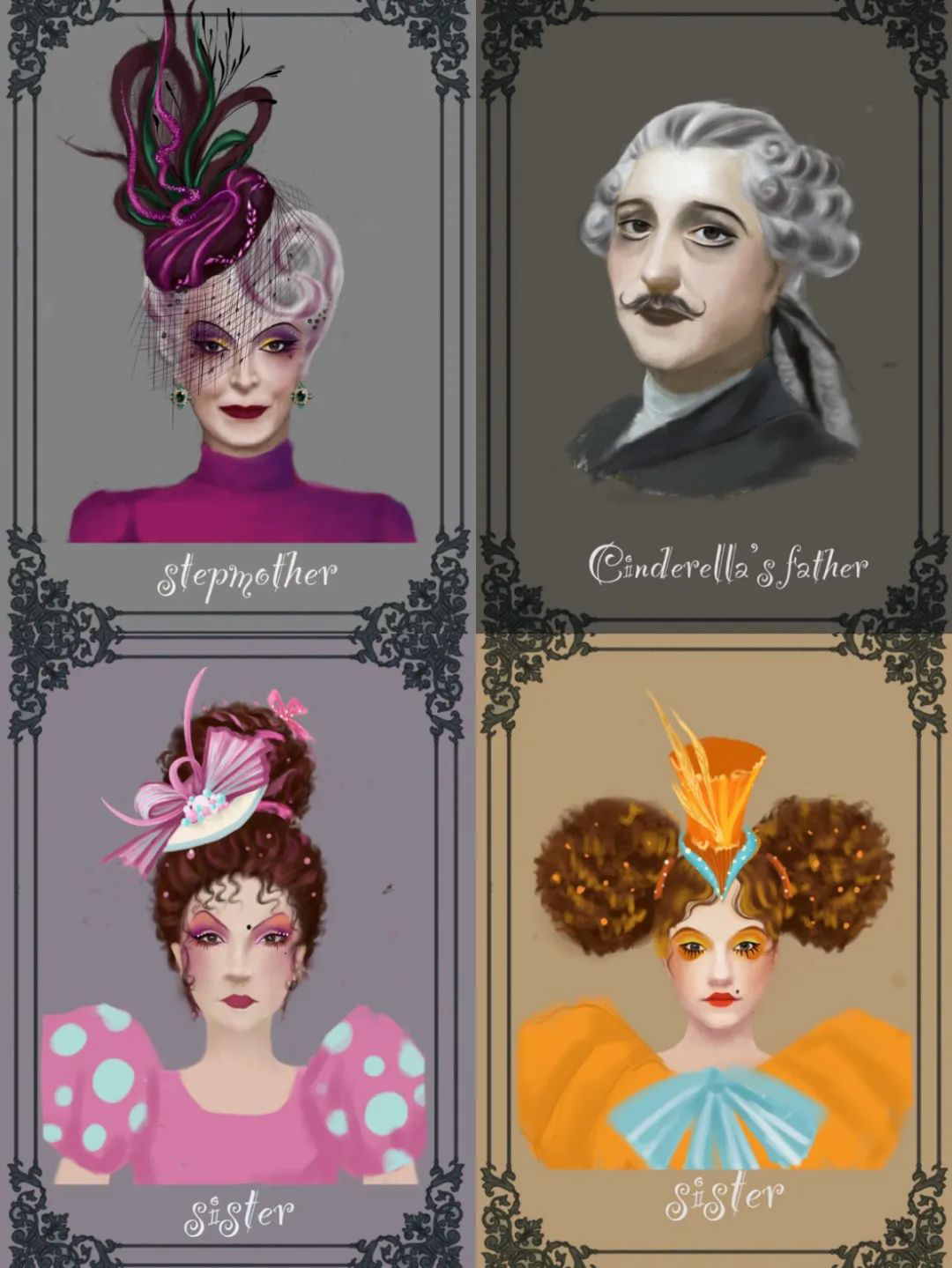 后妈的服装整体色彩偏艳俗,和亲妈和灰姑娘素雅的体系做区分,和大姐二姐的廓形和颜色都要靠近成为同一体系。同时这一家人又要处于同一个阶级,尤其是和灰姑娘父亲要产生夫妻的和谐感。