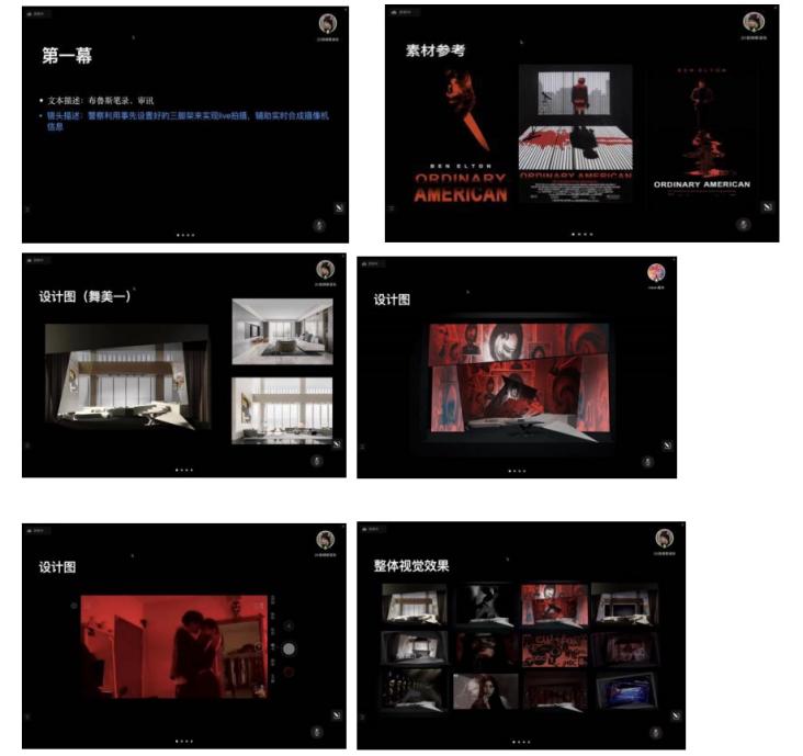 另一方面,每周的剧组制作会议也在线上如期举行,到目前为止共开会讨论7次。身处各地的主创人员通过“云开会”的形式隔空聚集,碰撞思路、阐述创意。老师和同学们积极发言,提出自己的想法,积极沟通协调舞美、灯光、服化和多媒体等方案,并根据上海疫情防疫政策的变化随时作出调整。