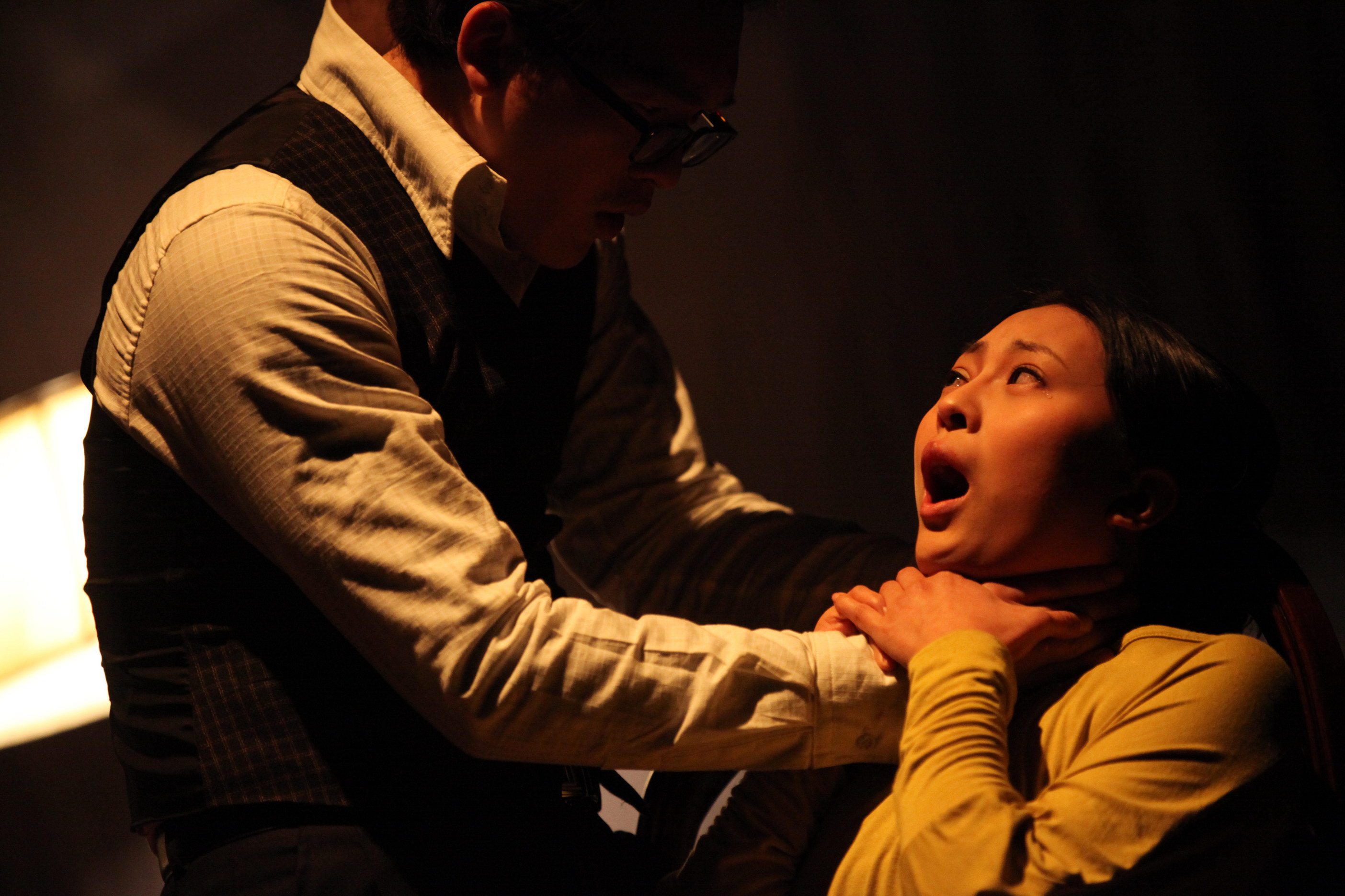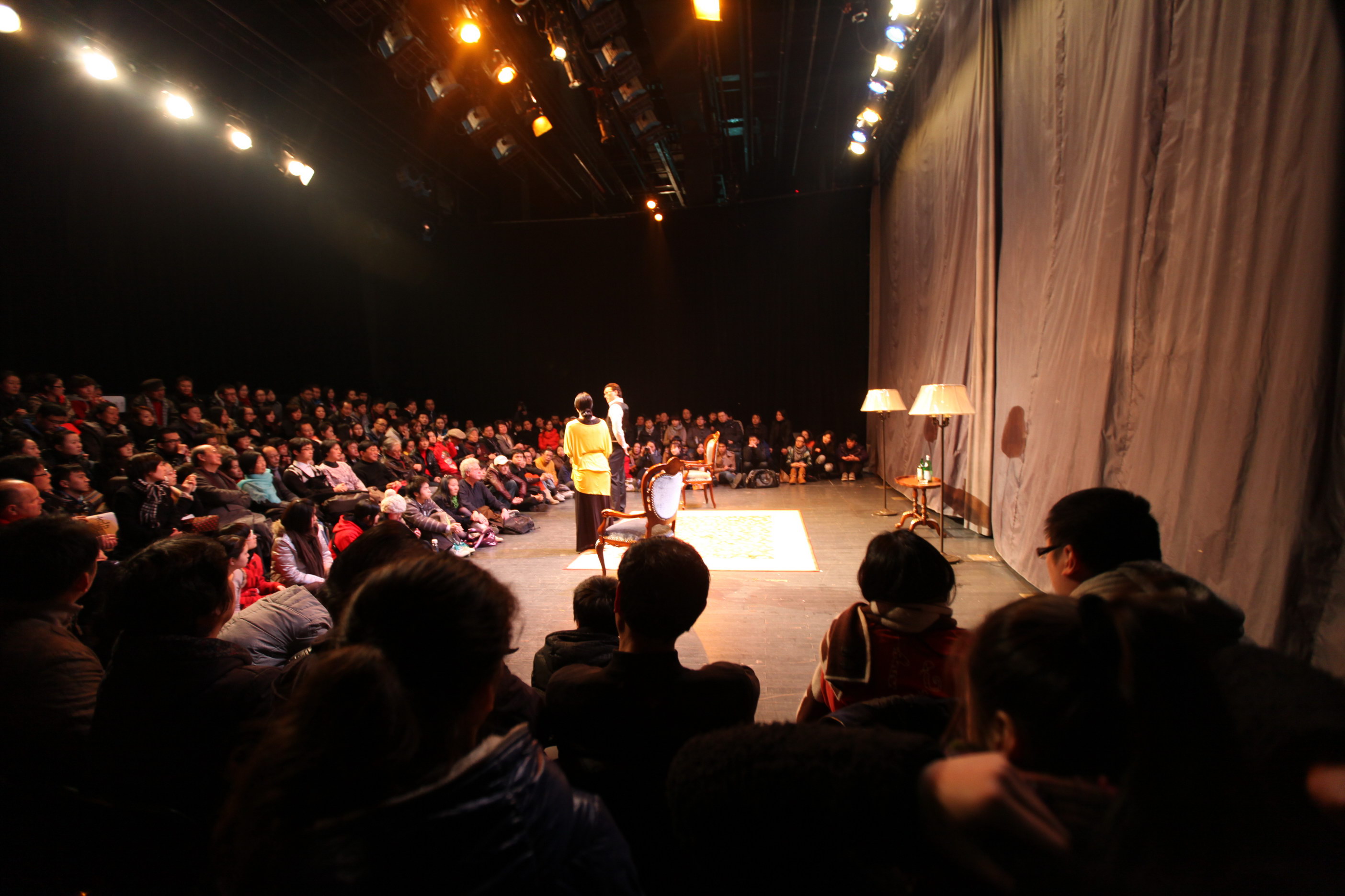 谷:是的。他们从演技角度得到了锻炼,中间经历脱了几层皮的感受和炼狱般的煎熬,但最终是一种完全脱胎换骨的享受。举个例子,两个人在戏中一个坐着,一个站着,他们一开始不知道应该怎么去站位,我就让他们不断变换角度和姿势,寻找自己最舒服和最合适的站位,用内在的正确感自己去体验,最后他们找到了。另外我透露一下,其实他们在今天演出时漏掉了一段台词,但两个人处理得非常好,很即兴。