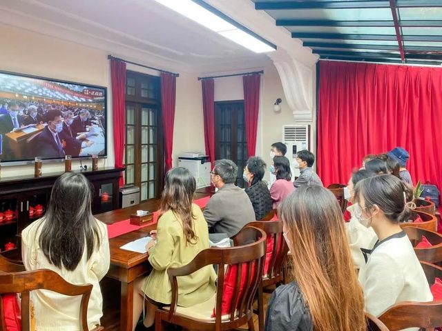 十时,大会正式开幕。随着习近平总书记铿锵有力的话语,师生们认真聆听了党的二十大报告。不少师生还不时记着笔记,不断记录着报告中的金句。