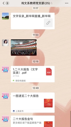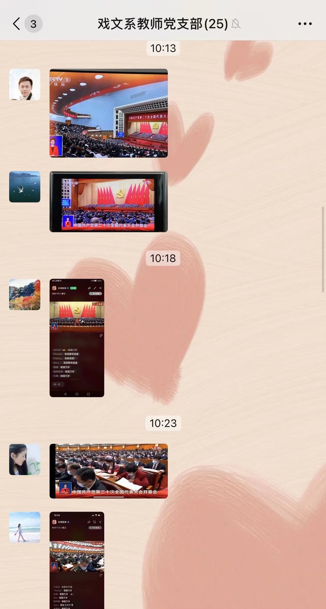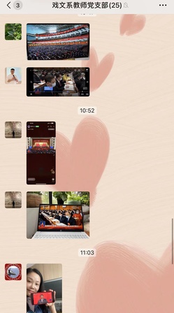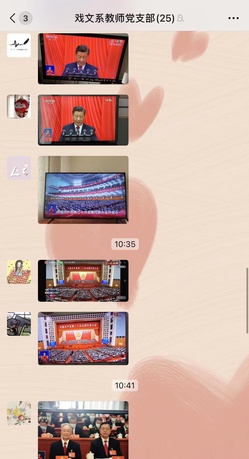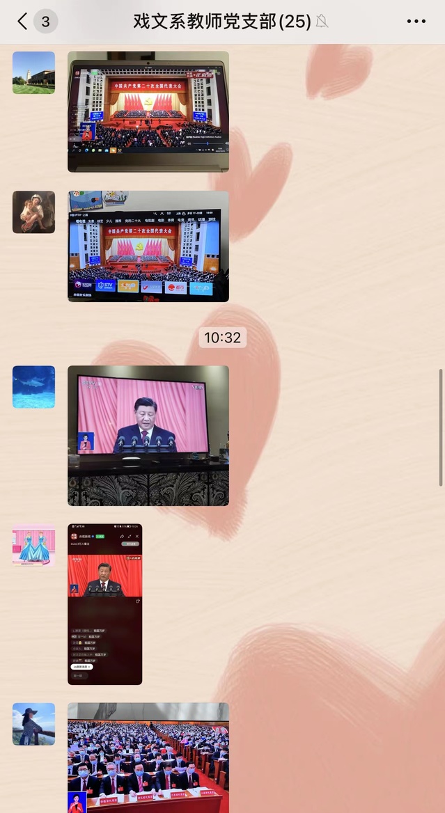在戏剧文学系党总支的组织下,戏文系党员师生于线上、线下共同观看了党的二十大开幕会直播,认真聆听和学习习近平总书记代表第十九届中央委员会向大会所作的报告。观看结束后,大家都备受鼓舞,纷纷表达了自己的感受。