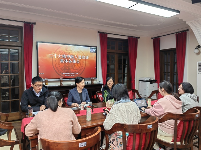 会议伊始,陈敏老师就提出思政课老师要率先学深悟透党的二十大精神,要将党的创新理论成果融入课堂教学中,要遵循教育部和上海市教委集体备课会要求做好党的二十大精神融入思政课工作。在随后的集中备课中,曹骏扬老师以“关于党的二十大精神融入‘原理’课教学的若干思考”为题进行交流,表示思政课教师学习领悟党的二十大精神的应尽之义是反复研读、领会吃透,认为要实现大会精神的有效融入,首先要对本课特点和难点有清晰的认识,并强调要紧密联系社会现实问题,结合马克思主义文艺理论从宏观视角和相关知识点上找出融入点。桑新梅老师从历次党的代表大会召开之“时间之谜、地点之谜、人数之谜”带来一场关于历史与现实之间的思考,并从实现中华民族伟大复兴的视角交流党的二十大精神如何融入“纲要”课程。王奥娜老师以“核心价值观和文化自信”为主题就“思想道德与法治”课程进行分享交流,讲到了社会主义核心价值观在树立文化自信、提高国家文化软实力方面的重大意义。肖永奎老师、徐霞老师和王娅奇老师就党的二十大报告中的新理念、新提法、新论断融入“习近平新时代中国特色社会主义思想概论”和“毛泽东思想和中国特色社会主义理论体系概论”课程进行交流。施华东老师在概述党的二十大报告要点的基础上,提出“形势与政策”课要从讲“变”、讲“新”、讲“精”、讲“准”入手宣传宣讲二十大精神。陈敏老师则从思想理论的飞跃是马克思主义与时俱进的品质,深刻领悟马克思主义中国化时代化新的飞跃及党的二十大精神融入研究生思政课的思考等三个方面进行了交流。