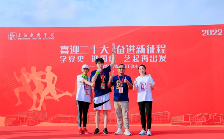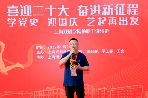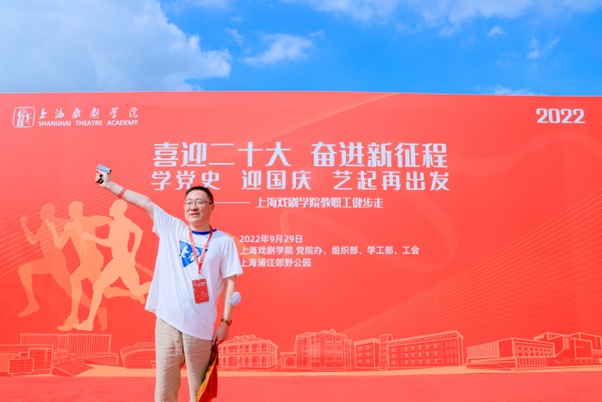 舞美系辅导员张译月带领同学自编热身操,带领老师们热身,为健步做准备。电影学院李姣老师则献唱了一曲《美丽中国》。
