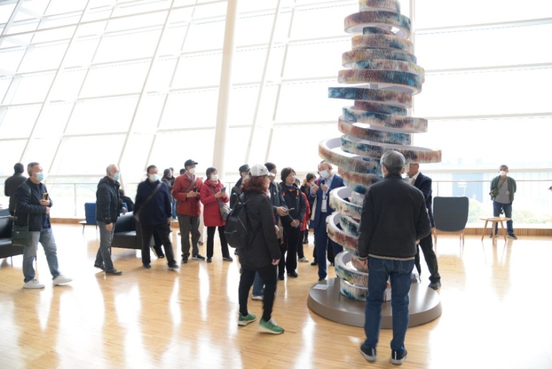 来到三楼阅读广场,离退休党员同志们随即被上方大型艺术装置《鸟飞了》所吸引,设计师让842 只“鸟”以其独创的“英文方块字”形式自书页的左上角飞升而起,飞离书本,向楷书、隶书、小篆一路回退,最后追溯到远古的象形文字,以全新的视角带给大家遐想和思考。装置艺术《知识之塔》,由近8000张昔日读者使用的图书索引卡堆栈而成,双螺旋结构又隐喻生命之循环,老同志们为其设计所吸引,纷纷驻足欣赏。