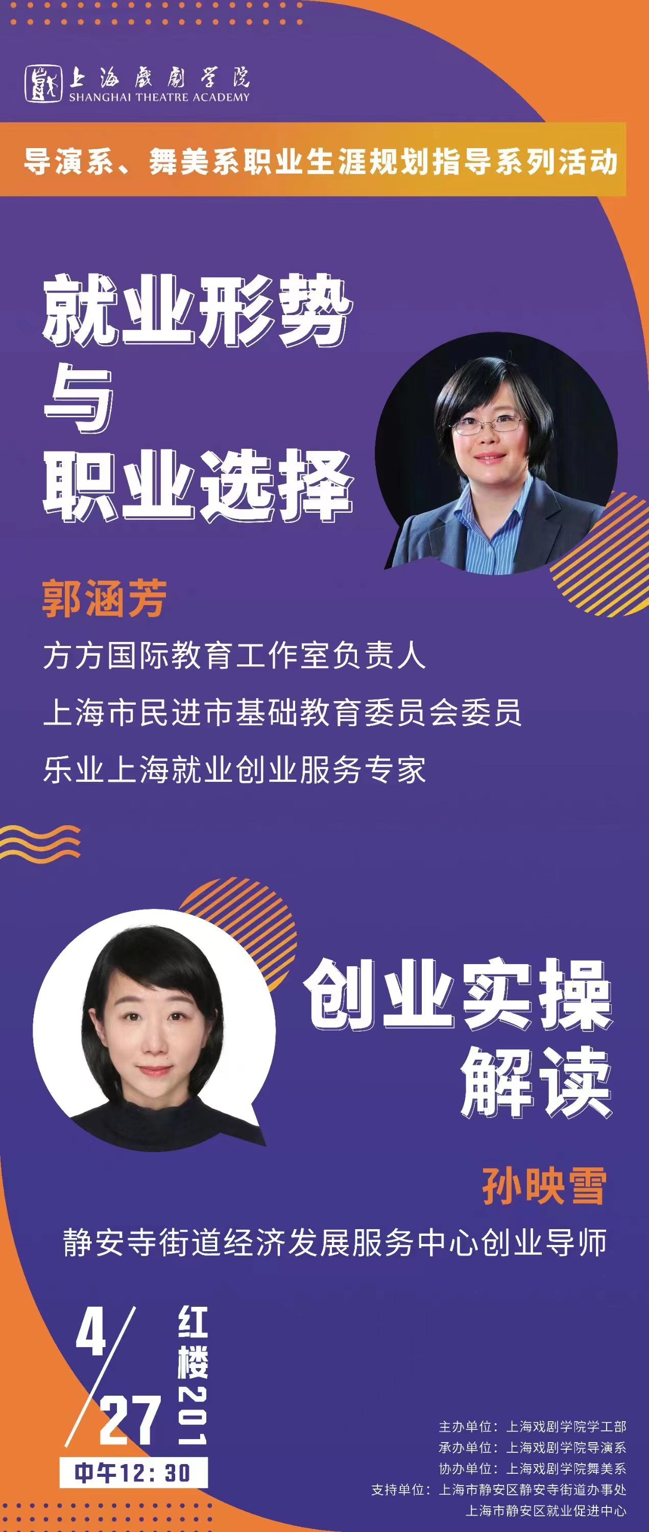 2023年4月27日下午,由taptap点点体育导演系承办的导演系、舞美系职业生涯规划指导系列活动在红楼201教室如期举行。本次讲座导演系党总支副书记石俊老师邀请到乐业上海就业创业服务专家郭涵芳、静安寺街道经济发展服务中心创业导师孙映雪,为导演系、舞美系学子进行了有关就业、创业的经验指导。上海市静安区静安寺街道办事处、上海市静安区就业促进中心对此次讲座给予了大力支持。