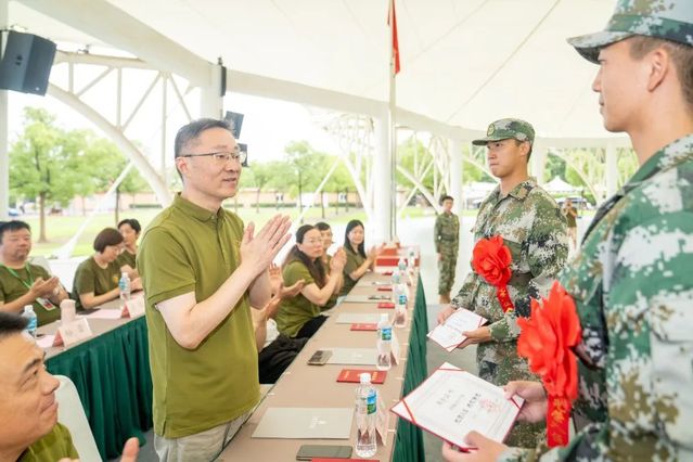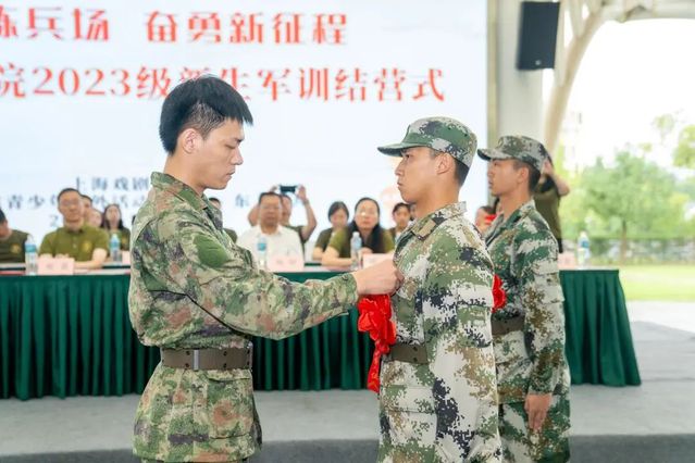 本次结营仪式最感人的环节,是为今年应征入伍的舞蹈学院毕业生于丁盛、戏曲学院毕业生孙嘉伟壮行。退伍老兵代表宋润达庄重地为两名新兵戴上红花,以战友和校友的身份勉励他们在火热的军营中经受各种考验,努力将自己锻造成为合格的军人,不辜负亲人,不辜负母校,不辜负祖国的殷切期望。佩戴红花的两名新战士走上主席台,从校领导手中接过入伍证书,开始了他们崭新的军旅生涯,也为2023级本科新生带来了心灵的洗礼。