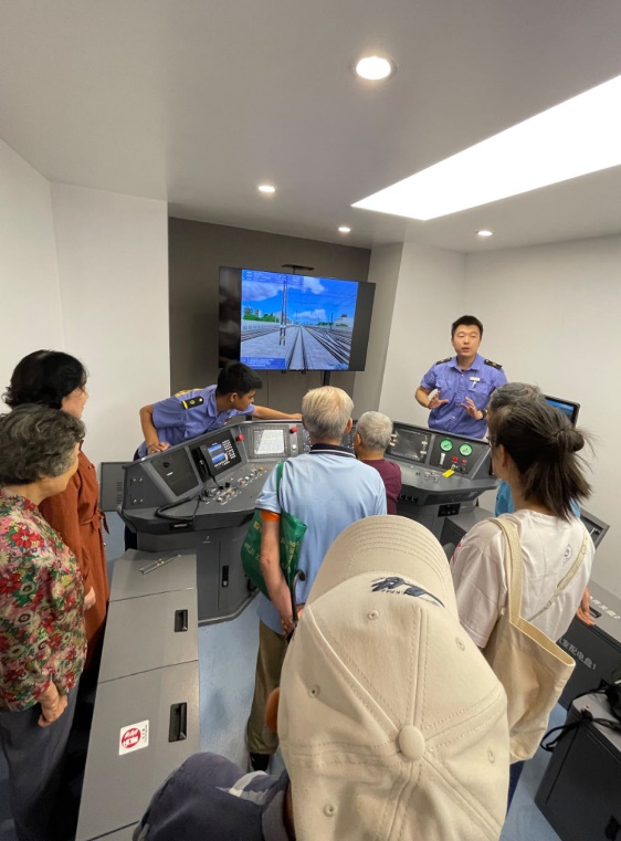 走出“周恩来号”机车展室,老党员们来到段内融创精英中心,这里展示了上海机辆段所有科研创新成果,老党员们在参观中深切感受到铁路发展中科技创新的生机和力量,中心的机车模拟驾驶操控台平时用于实操培训,大家饶有兴致地驻足观摩,在现场工作人员的指导下,老党员们现场体验了高铁的模拟驾驶。