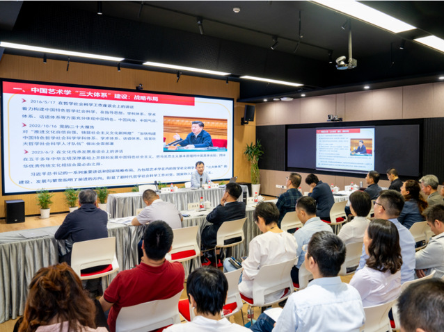 为进一步推动习近平文化思想的学习,本次学习会特邀东南大学特聘教授、博士生导师、社会科学处副处长,国家文旅智库东南大学中国艺术发展评价研究院院长甘锋作了题为《中国艺术学“三大体系”建设:战略布局、研究进展与评价标准》的主题报告。
