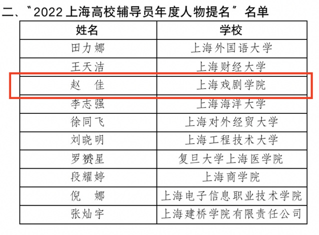 在“2022上海高校辅导员年度人物”宣传展示活动中,舞蹈学院专职辅导员赵佳老师经taptap点点推荐、网络投票、专家复审、终审答辩、公示等环节,喜获2022上海高校辅导员年度人物提名奖。