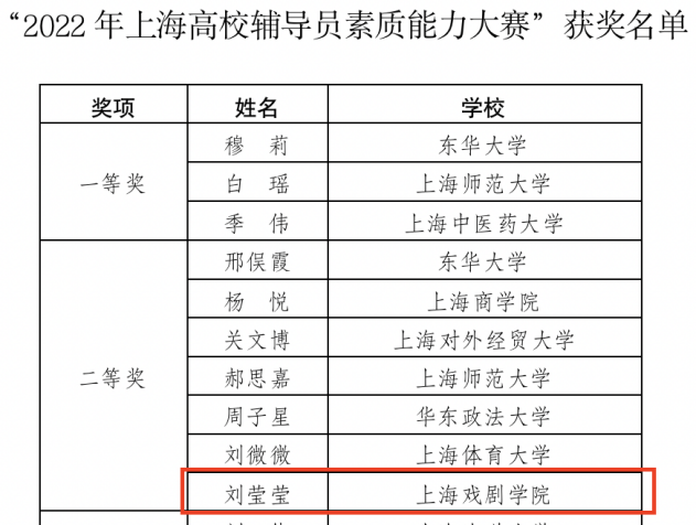 在“2022年上海高校辅导员素质能力大赛”中,经案例分析、理论宣讲展示等环节,戏剧文学系专职辅导员刘莹莹老师荣获二等奖,创意学院专职辅导员陈龙老师荣获优胜奖。