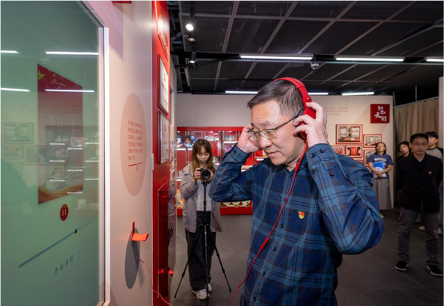 “每日一读”,是创意学院党组织运用新媒体平台推动党员坚持学习党的创新理论的一种方式,展览中一个重要的交互环节,就来自于“每日一读“。参观者可点击跟读党的二十大报告或是习近平总书记重要讲话节选,读完之后扫描二维码,即可在手机上收听自己所读的内容。