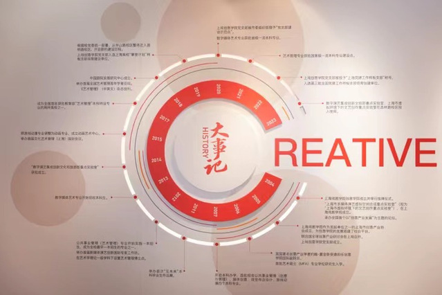 本次展览中的“创·发展新平台”板块,则展现了创意学院打造的多个高端的学术平台。从数字演艺集成创新文旅部重点实验室、上海市虚拟环境下的文艺创作重点实验室到《艺术管理》期刊、中国剧院发展研究中心,以及面向国内外学界和业界举办的一系列论坛、研讨会、工作坊等,都形成了一定的影响力,并不断拓展着创意学院的办学平台、学术视野和产业支撑。