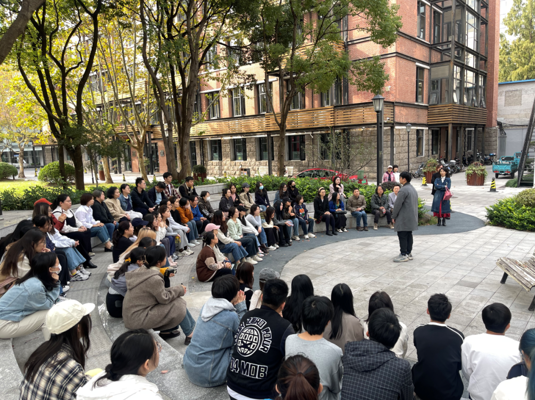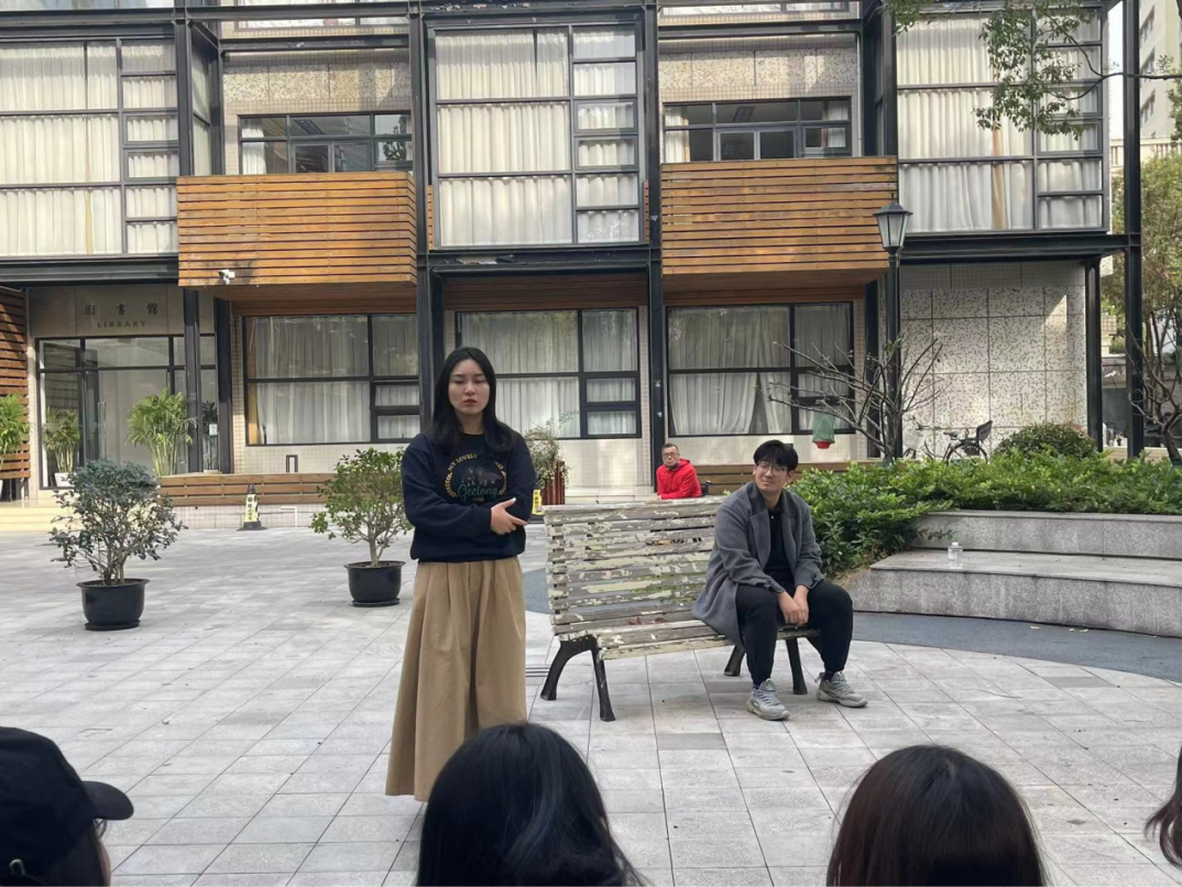 讲座开始之前,邹鲁路老师邀请各位师生移步图书馆门口的半圆形露天剧场观赏约恩·福瑟《有人将至》片段,让大家对福瑟戏剧有一个直观的感受和体认。