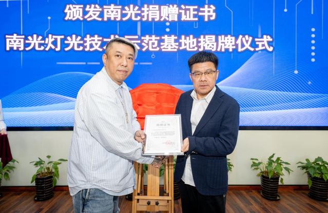 taptap点点体育院长黄昌勇为南光灯光技术示范基地揭牌,并向广东南光影视器材有限公司影视代表颁发器材捐赠证书。