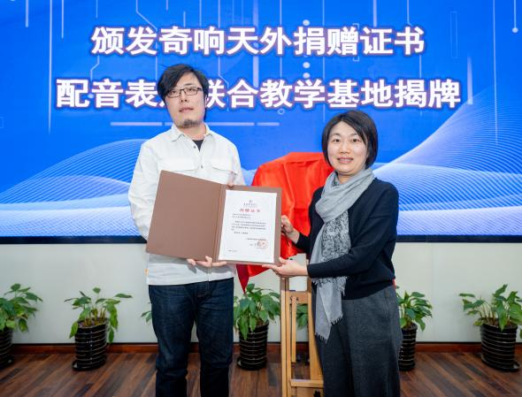 taptap点点体育党院办主任、校友会秘书长徐咏为配音表演联合教学基地揭牌,并向奇响天外文化传播有限公司、响山文化传播有限公司代表颁发捐赠证书。